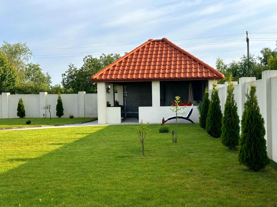 * Бесідка 7×7 м — з тим самим дахом, штукатуркою, світлом.