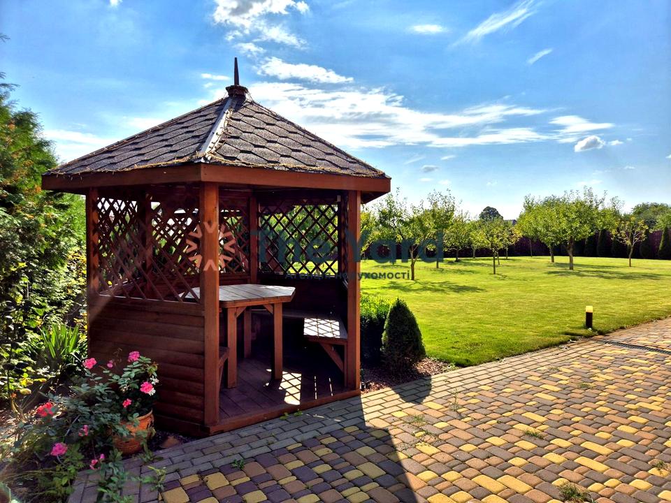 На території розкішної зеленої ділянки площею 17,5 сотки є фруктовий сад, висаджено більше ста дорослих туй та декоративних рослин, розміщена зона барбекю, альтанка з натурального дерева, гойдалка, теплиця, погріб над яким встановлено залізний гараж, як додаткове місце для зберігання інвентарю.