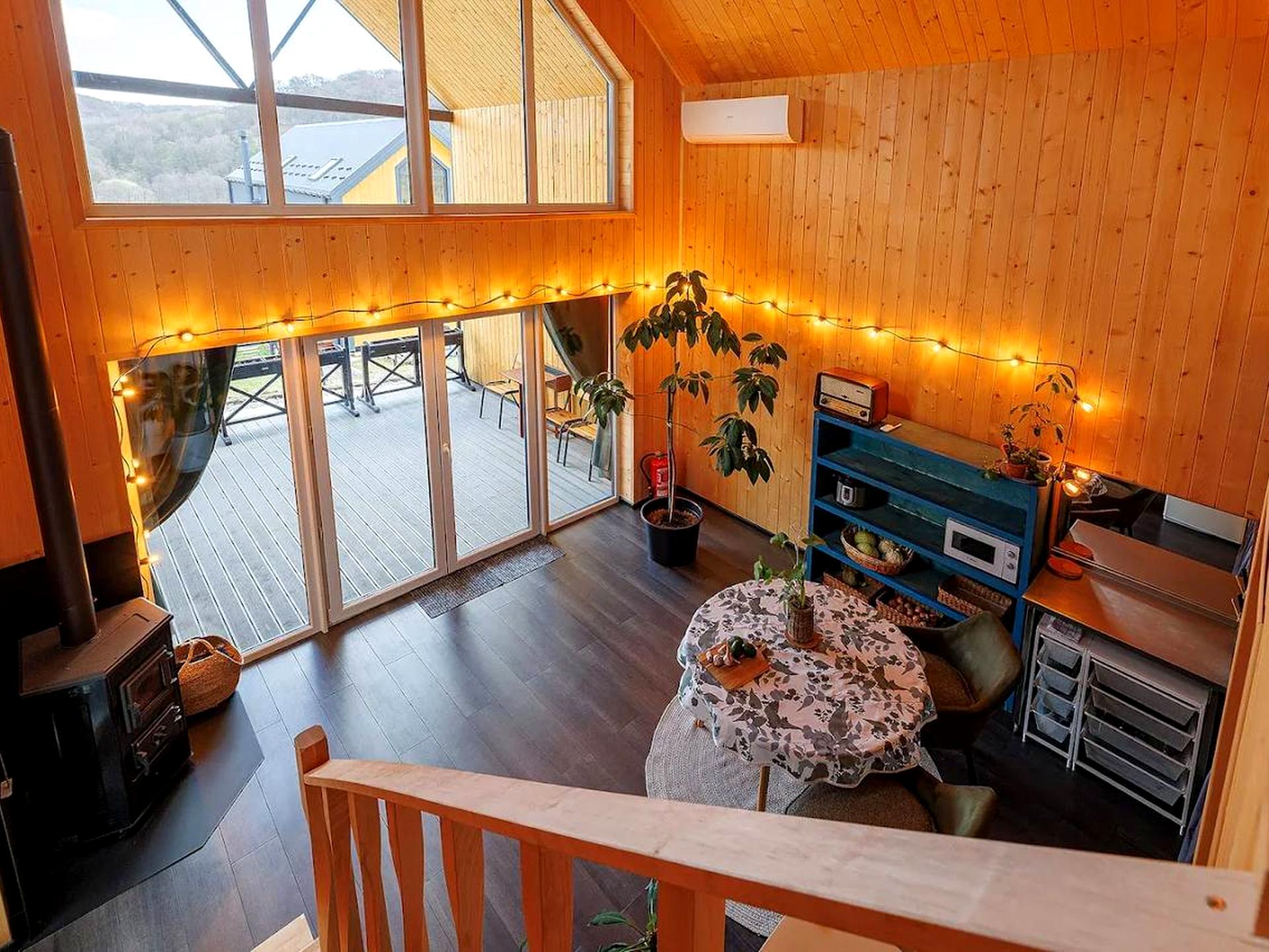 Сучасний будинок з меблями та технікою: кухня-вітальня, спальня, санвузол, гардероб. Тераса 40 м², ділянка 4 сотки, паркомісце та гостьовий паркінг. Підігрів підлоги, кондиціонер, камін-піч, панорамні вікна.