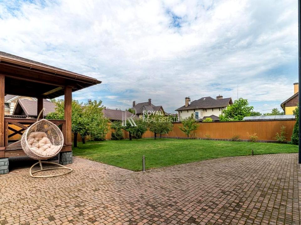 Додатково: окрема будівля з лазнею та підвалом 100 м², два гаражі на чотири авто, тераса.