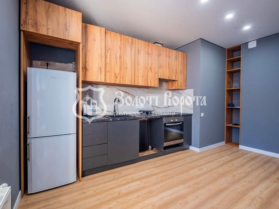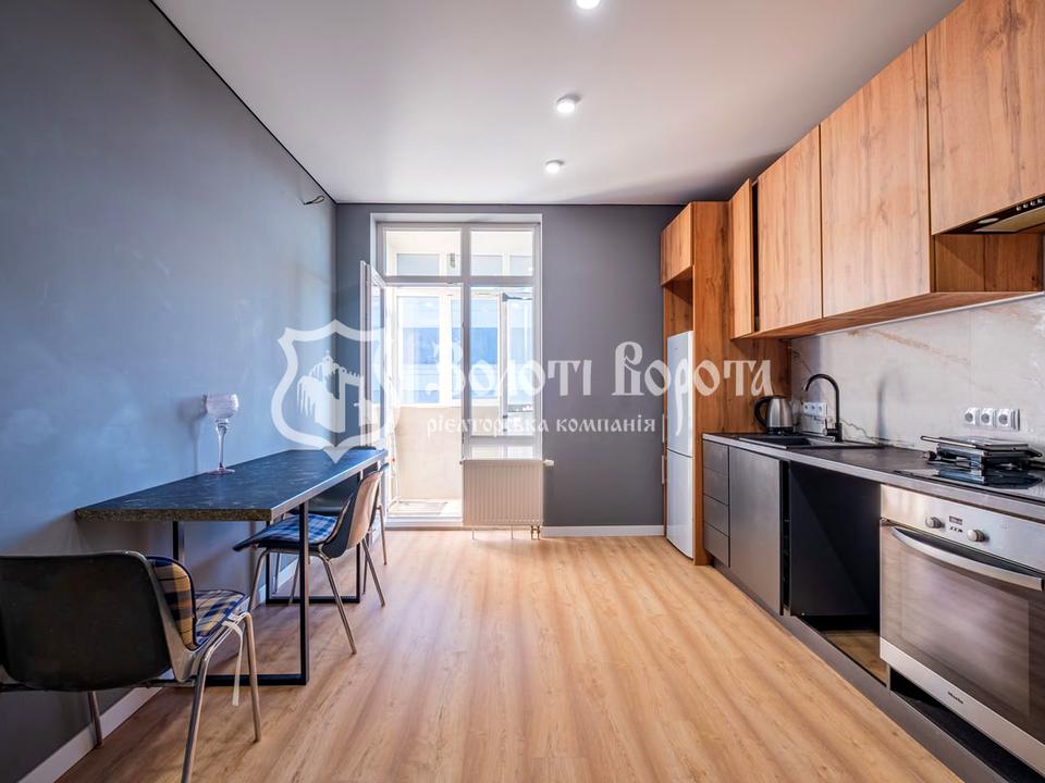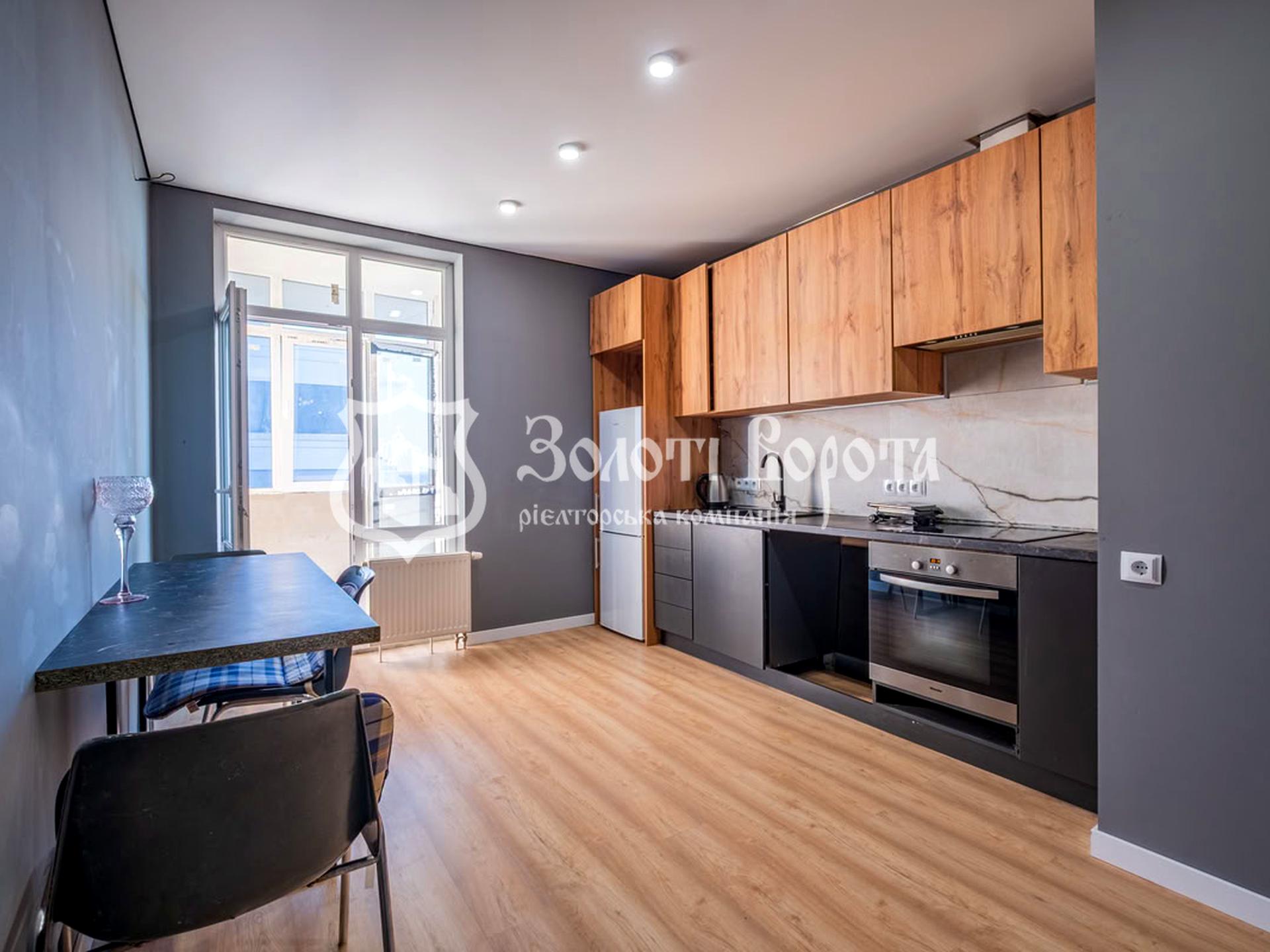 Кухня з виходом на балкон виконана у сірих відтінках з дерев'яними елементами. Особливістю є дві зони санвузлів: одна з душовою кімнатою, облицьованою дорогою плиткою, сучасною сантехнікою та оригінальною підвісною тумбою-раковиною з дубовим акцентом; інша — з пральною машиною, бойлером та туалетом (без оздоблення стін). Всі меблі та техніка залишаються новим власникам.