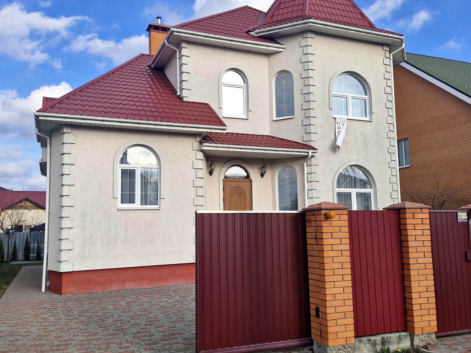 Побудований з газоблоку, утеплений.Загальна площа 254 кВ.м, має три поверхи. Розташований на ділянці 5 соток. Ділянка повністю огорожена, має відкатні автоматичні ворота, вимощена тротуарною плиткою та засіяна газоною травою .