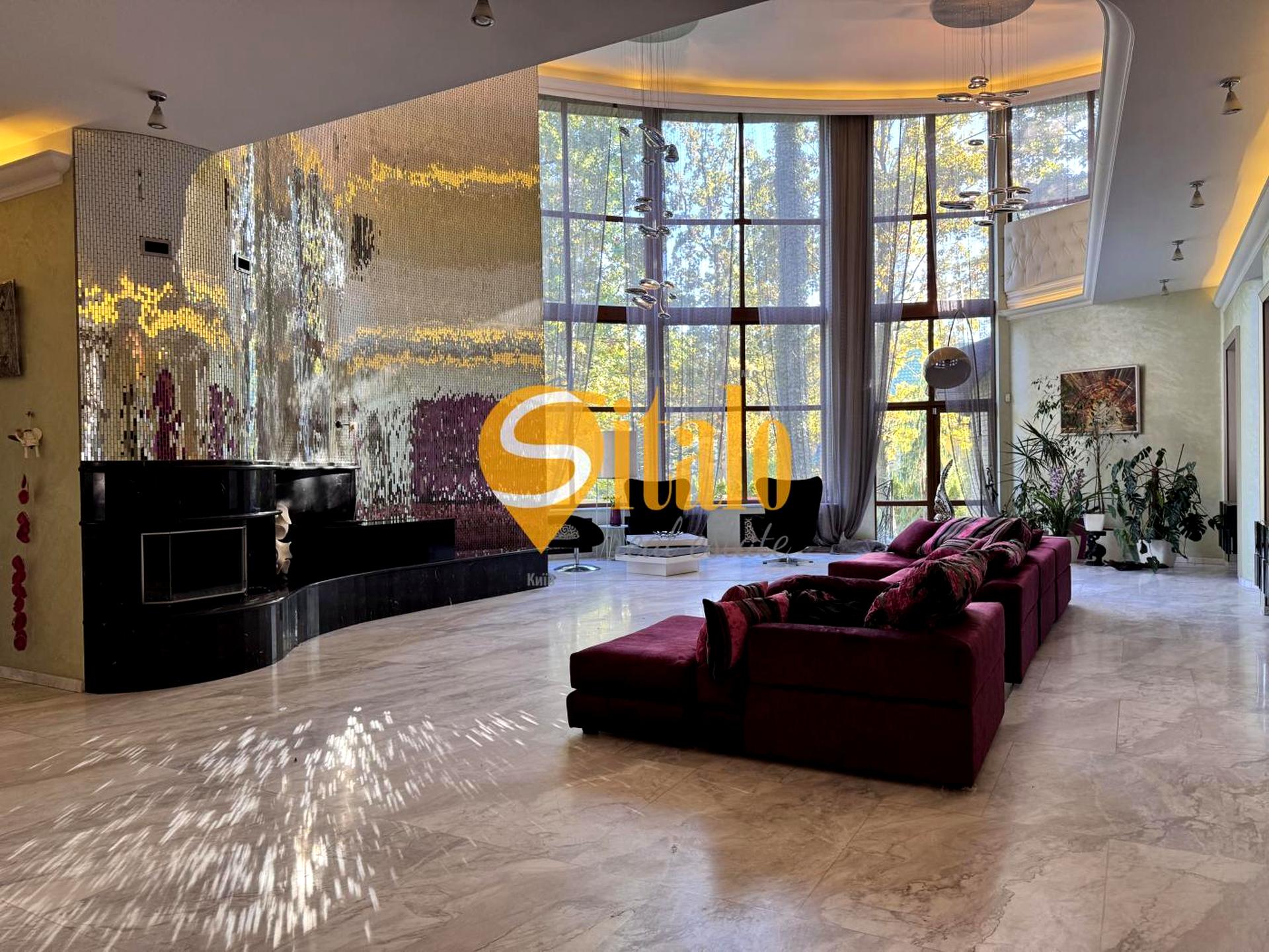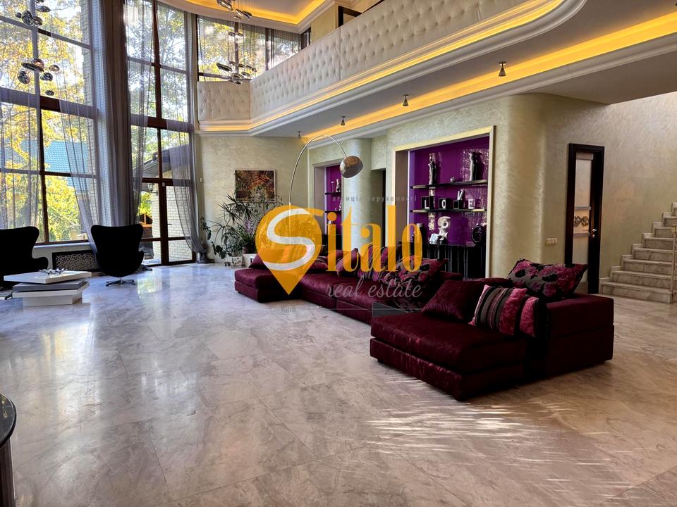 Будинок з авторським дизайном, повністю мебльований і оснащений сучасною технікою. Інтер’єр вирізняється панорамними вікнами, які наповнюють простір природним світлом. Вітальню прикрашають стильні люстри та декоративні елементи з фіолетовими акцентами, що надають їй вишуканості. Підлога та підвіконня виконані з натурального граніту, в спальнях — дерев’яний паркет, який підкреслює елегантність та розкіш простору. Дворівнева вітальня з сучасним освітленням і декоративною балюстрадою додає будинку неповторного шарму.