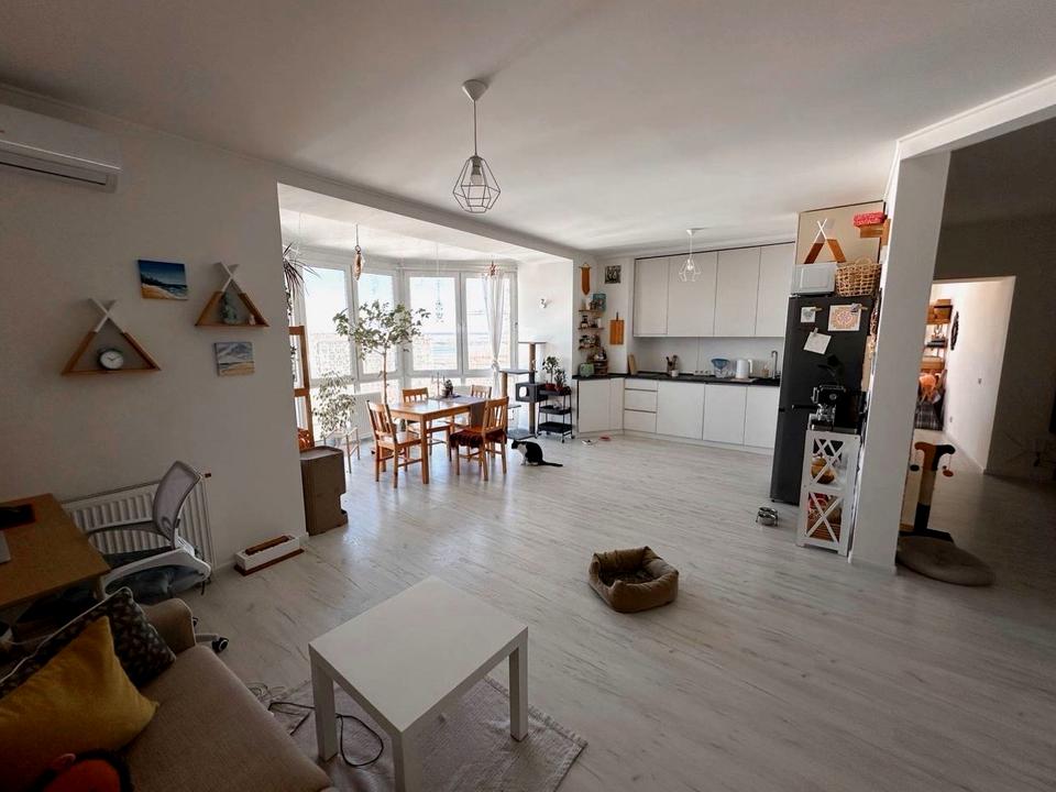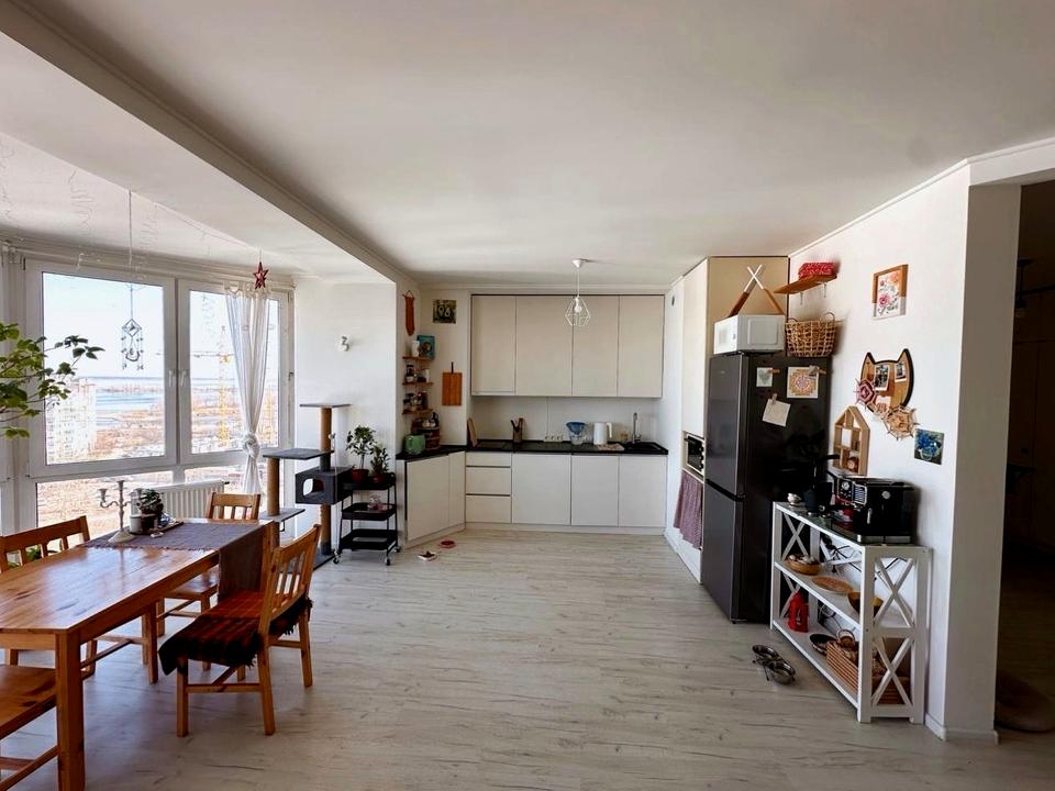 Загальна площа — 78 м². Зручне, продумане планування, великі панорамні вікна, завдяки чому в квартирі багато природного світла протягом усього дня. Взимку квартира тепла.