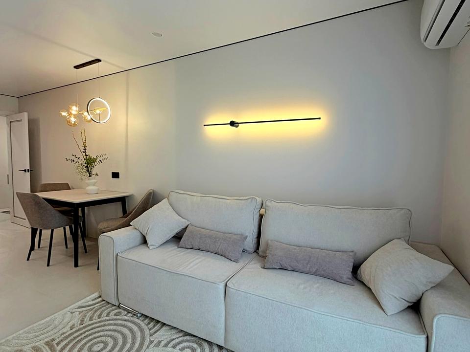 Фарбовані стіни, декоративна штукатурка, натуральні текстури — все виглядає легко і дорого без зайвої “перегрузки”. Кожен елемент — від освітлення до меблів — підібраний так, щоб створювати цілісний, гармонійний інтер’єр.