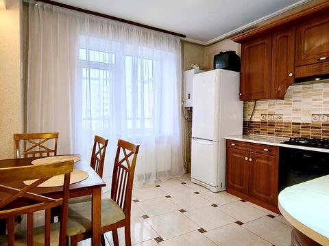 Світла, з панорамним вікном кухня, виконана в сучасному стилі. Є вбудований, прихованого монтажу холодильник, духова шафа, газова варильна поверхня. Обідня зона зі столом та стільцями.