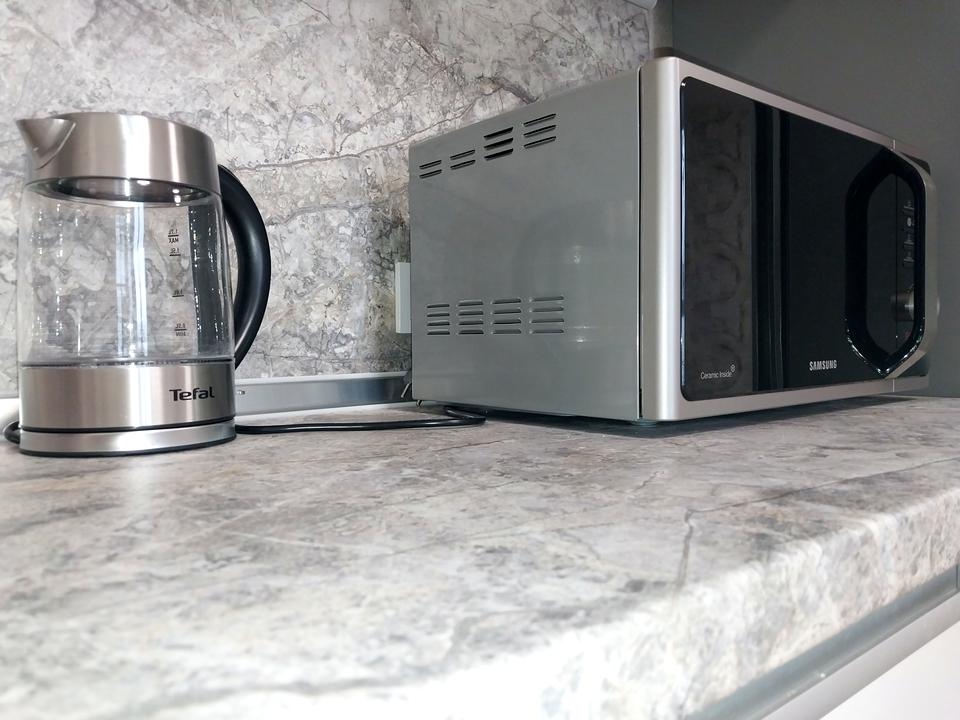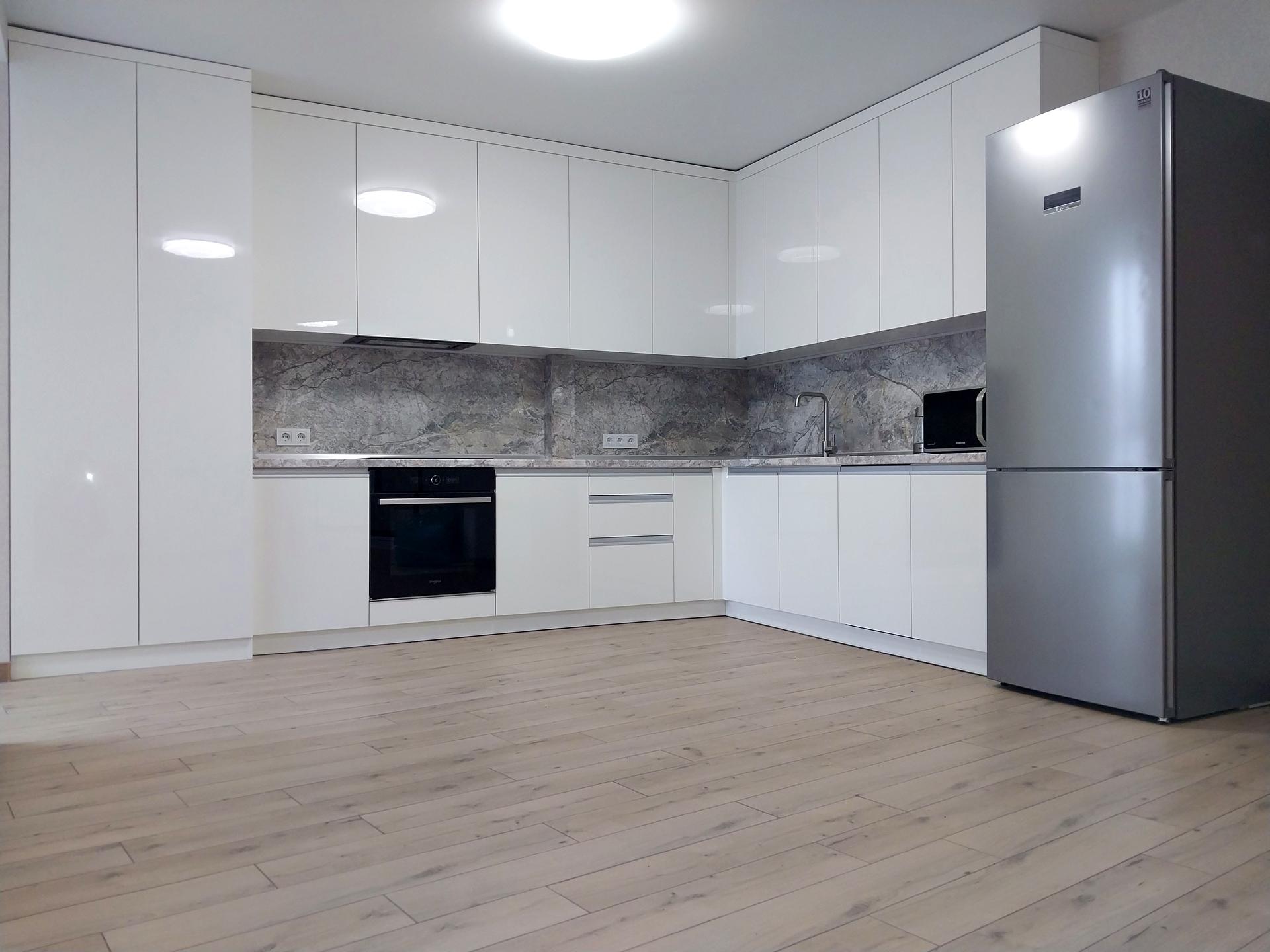 Мебель и техника (три кондиционера, индукционная варочная поверхность, вытяжка, духовой шкаф, микроволновая печь, холодильник, стиральная машина).