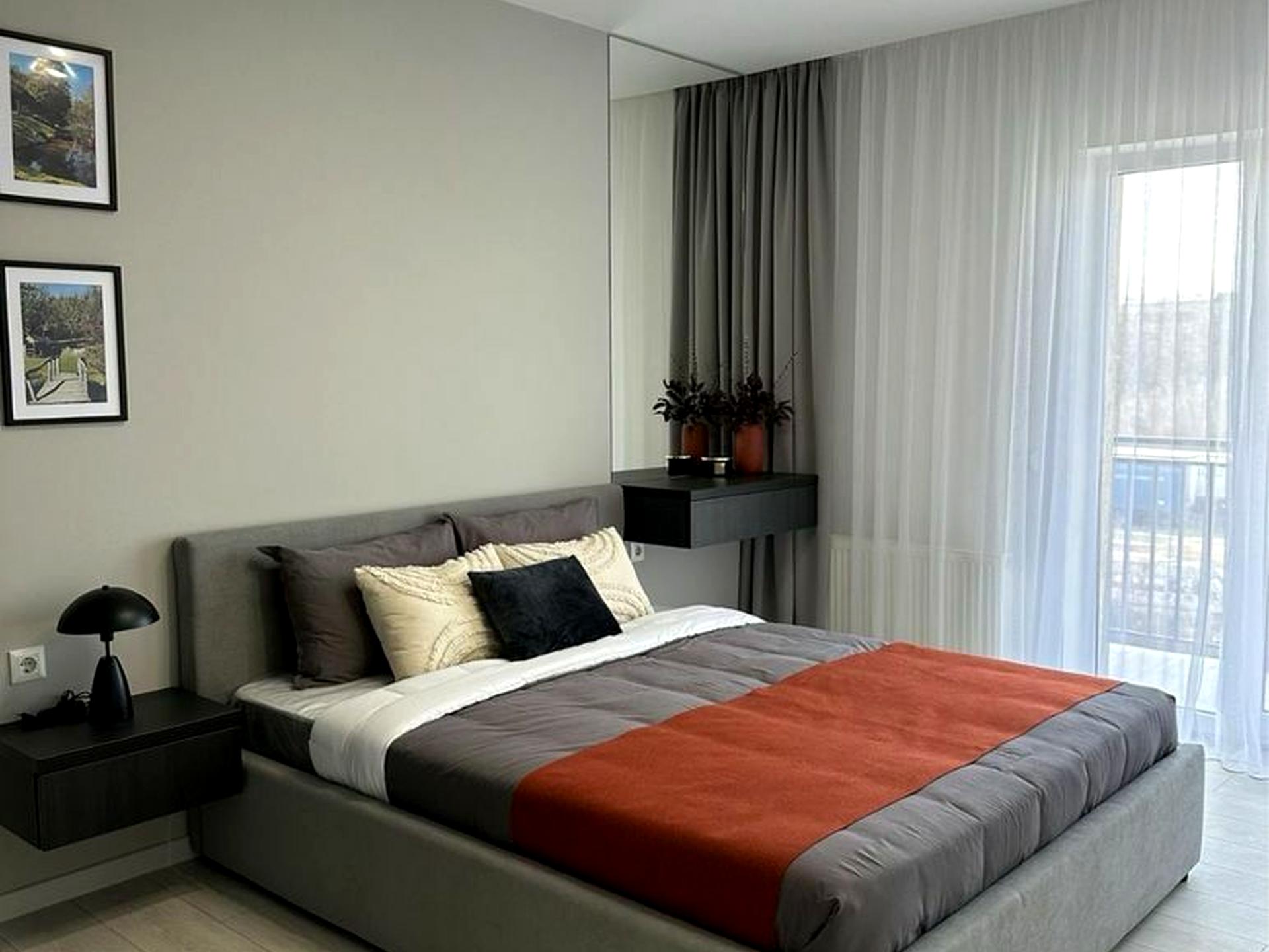 Квартира повністю мебльована: зручне двоспальне ліжко, диван, шафа, побутова техніка. Підходить для тривалого проживання.