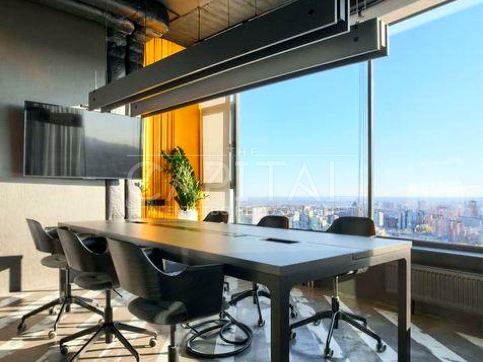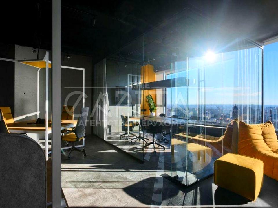 Унікальний стильний дизайнерський офіс на висоті 120м, поверх 38. Ремонт 2022 року. Панорамні вікна, вид на вул. Мечникова та центр Києва, стелі 3,5 м. Офіс повністю укомплектований всіма необхідними новими меблями та технікою, до 12 робочих місць.