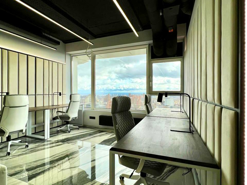 • Офіс розташований на 35 поверсі з панорамними вікнами, видом на Печерськ та центр столиці.
