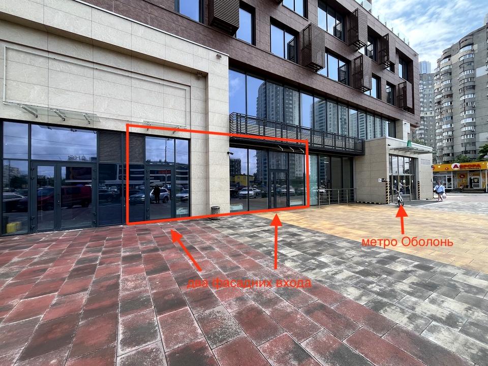 Фасад на Оболонський проспект, 2 фасадних входи/виходи, висота стелі 4 м, великі вітринні вікна.