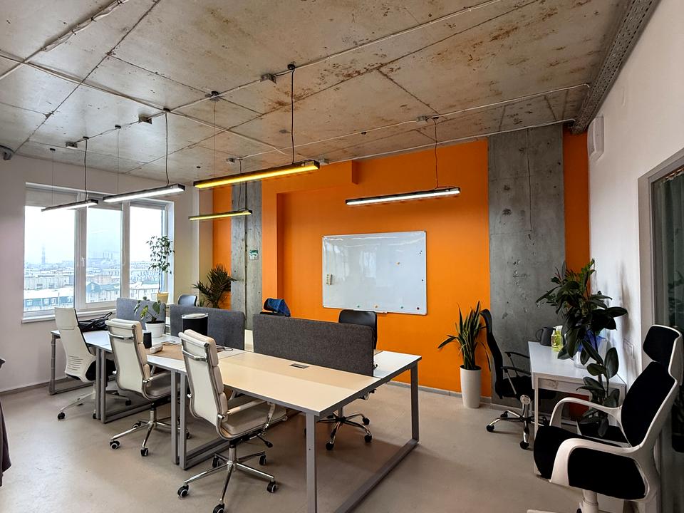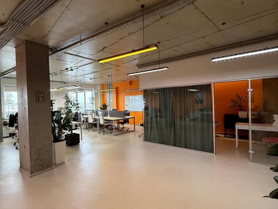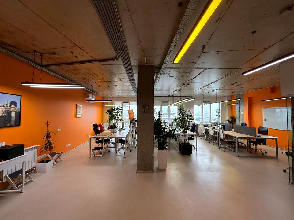 Більшість столів і стільців на фото орендаря - він забере, або можна викупити частково. За планом open space, своя міні-кухня, 2 с/вузли, виділений кабінет за скляною перегородкою. Зроблена приточна і витяжна вентиляція, є кондиціонер. Підлога - якісний офісний вініл Grabo Fortis Silver, в санузлах - керамічна плитка.