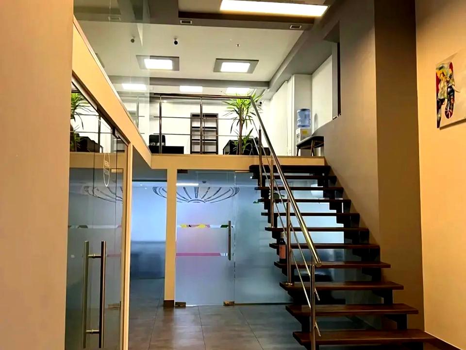 Две открытых зоны опен спейс, митинг рум, кабинет руководителя, открытая зона для работы сотрудников, кабинет отдыха и кухня, 4 с/у, душевая кабина.