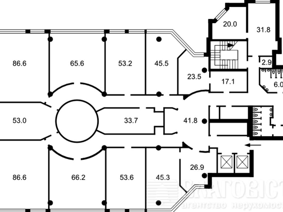 Офіс площею 958,8 м2 займає практично весь третій поверх 8ми поверхової секції офісного центру. На поверх в офіс піднімається два швидкісні вантажно-пасажирські ліфти.