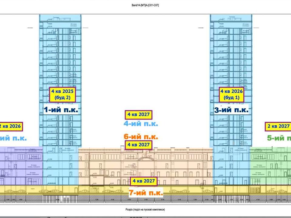 Здача секції в експлуатацію: 2 кв. 2027 рік. Поступова здача комплексу в експлуатацію починається з 4 кв. 2025 року.