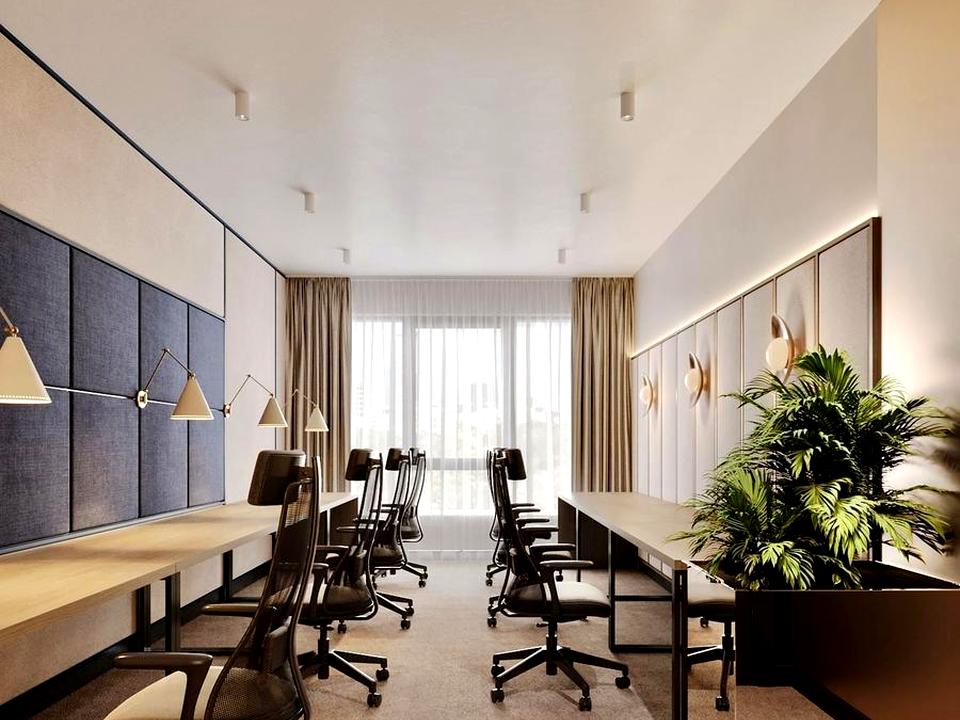 Офіс має сучасний дизайнерський ремонт із використанням якісних матеріалів. Великі панорамні вікна та високі стелі створюють відчуття простору й наповнюють приміщення природним світлом.