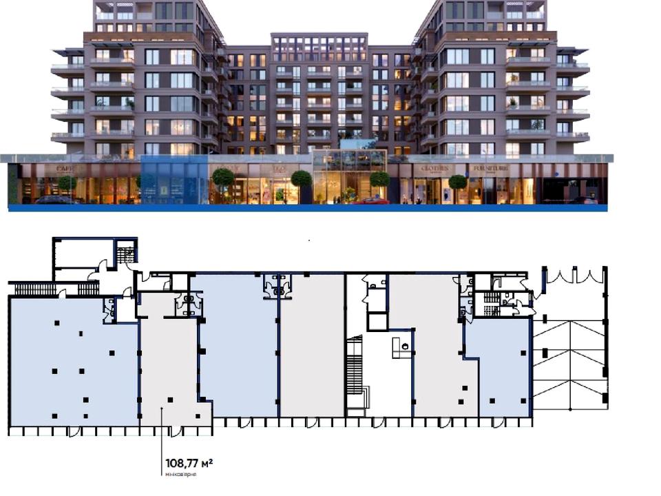 Пропонуєтся до продажу комерційне приміщення загальною площею 108,77м2, потужністю 18кВт, розташованному напершому поверсі будинку, приміщення фасадне.
