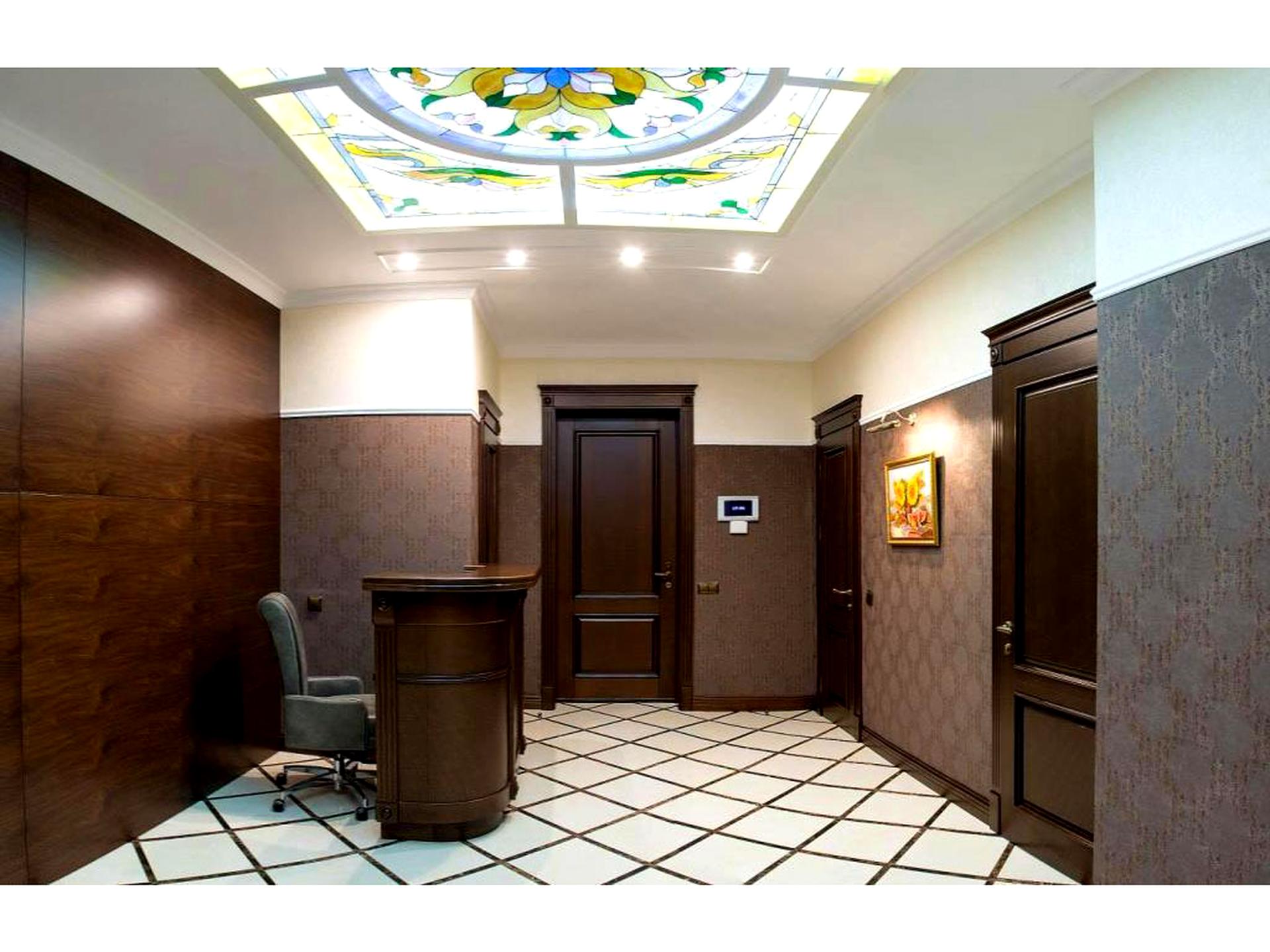 Декор: Мармурові підвіконня, вітраж Tiffany.