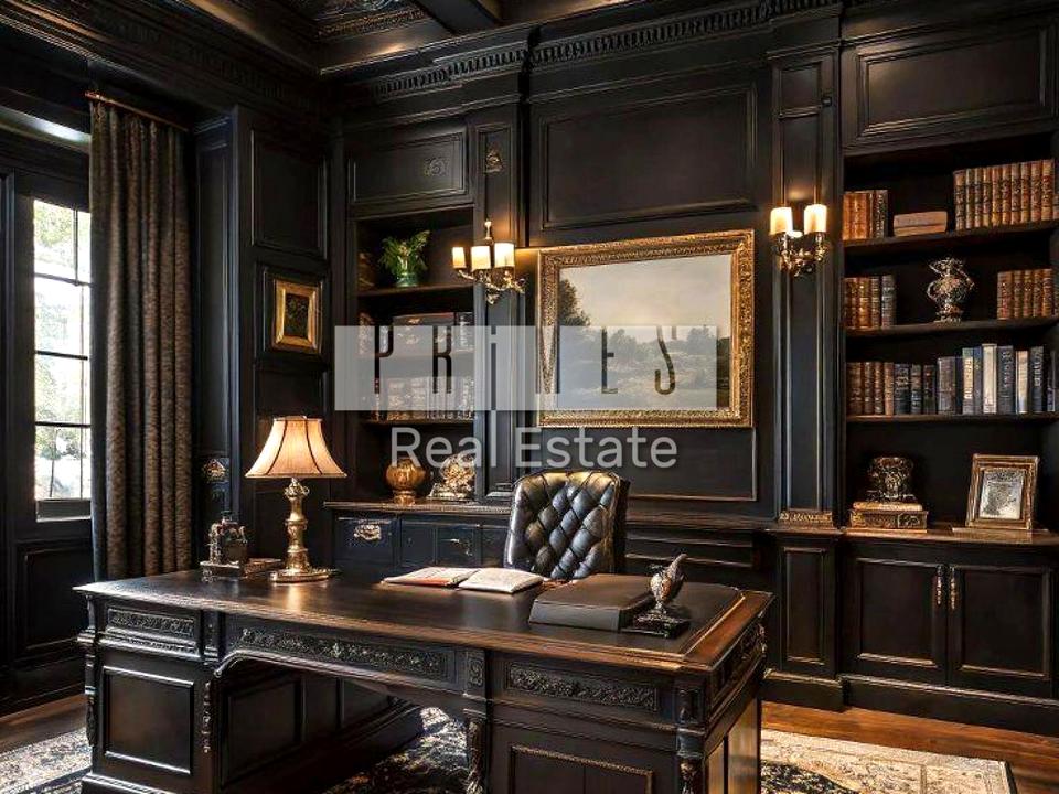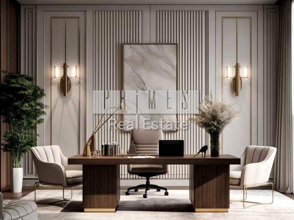 Окремо розташована будівля, окремий власний вхід та фасад. Сучасний офіс із розкішним ремонтом, виконаним із використанням люксових матеріалів: мармур, дуб, червоне дерево, дубова мозаїка. Простір оформлено в класичному стилі з вишуканими деталями — колонами, панелями ручної роботи, декоративними стелями та кришталевими люстрами.