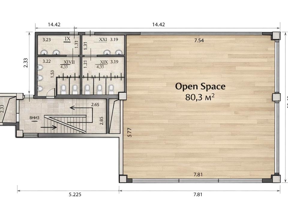 Приміщення у форматі повного open space з мокрою точкою, що дозволяє реалізувати широкий спектр бізнес-ідей: офіс, студія, салон краси, шоурум або інший комерційний проєкт.