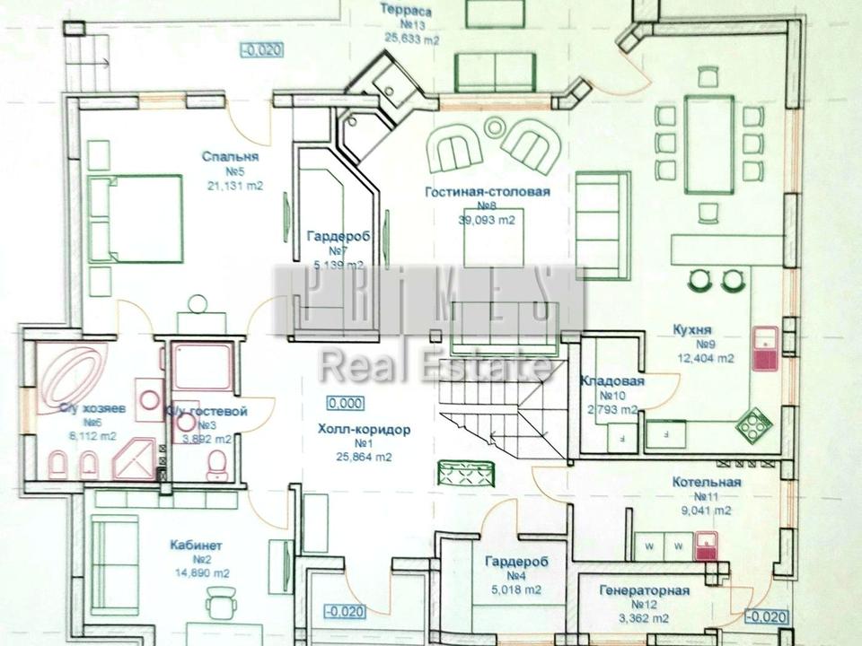 4 спальні (в тч майстер спальня зі своїм санвузлом та окремим виходом на терасу) 3 санвузли (2 на першому, один на другому поверсі) вітальня 55квм, друге світло (висота стель 6, 5 метра) Пральна, гардероб, майстерня, котельня, домашній кінотеатр, Три каміни.