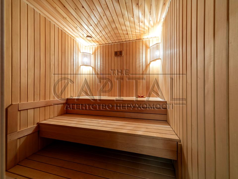 1 рівень: простора вітальня з каміном (H = 6 м), кухня, тераса, кімната відпочинку з виходом у сад, гардероб, спортзал, сауна.