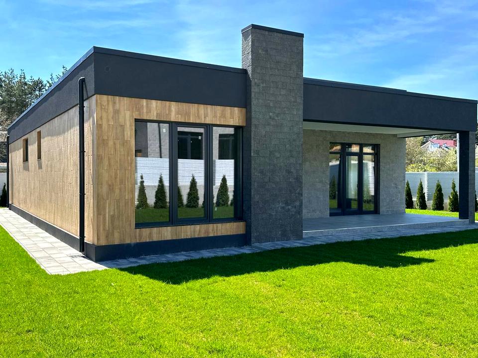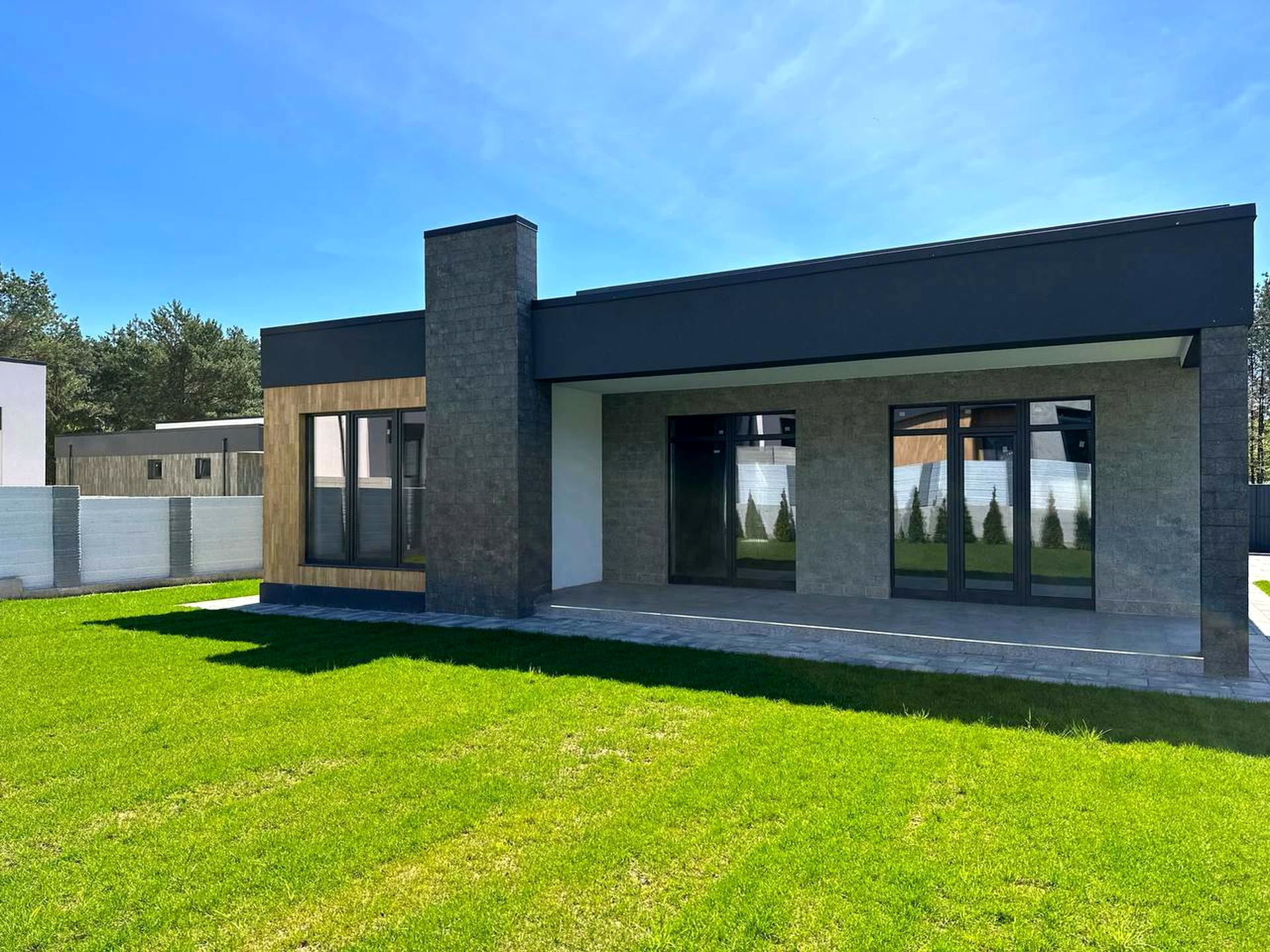 Будинок, 1 поверх, 3 кімнати. Матеріал стін - цегляно-монолітний, фундамент будинку - залізобетон, матеріал перекриттів - монолітний залізобетон. Під'їзд до будинку - асфальт. Площа ділянки 5 соток. Висота стелі 3.7 метра. Вид з вікон у двір, на парк. Планування кімнат Роздільне. Газ на вулиці. Холодна вода - свердловина, гарячої води немає. Опалення немає. У будинку 2 роздільних санвузла, туалет/ванна/душ. Сантехніки немає. Розводки труб немає. Вхідні двері броньовані, немає сходів. Покриття підлоги - стяжка. В будинку немає балконів. Тип кухні - кухня-студія. Вікна металопластикові, нові. Є дах. Є огорожа. Немає підвалу. У будинку є . Будинок побудований в 2024 році. Своя каналізація. У будинка 1 власник. Загальний стан будинку - Без ремонту. Автопарковка, Можливість прописки, охорона. Поруч є школа, дитсадок, зупинки, супермаркет, ліс, річка / озеро. Будинок приватизований. Терміново, Прямий продаж, Вільна, Ексклюзивний договір, Можливе розтермінування. Інтернет оптоволоконний. Зовнішнє утеплення стін. Власник погоджується продати по програмі єОселя. Працює без світла - вода. Без комісії