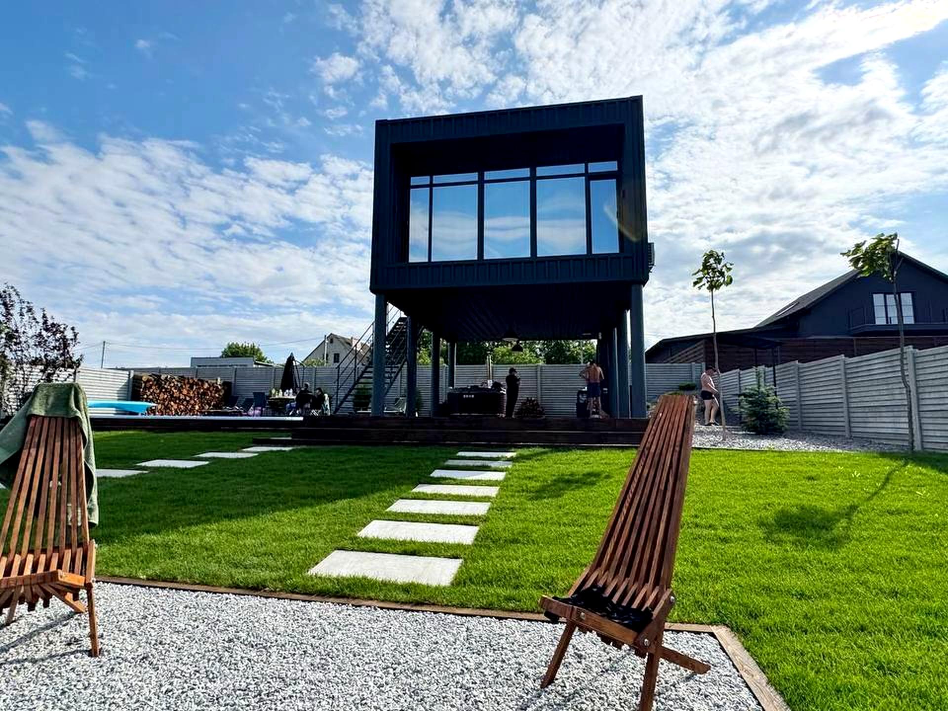 Под домом расположилась шикарных размеров терраса с чаном на дровах,зоной отдыха и мангалом.