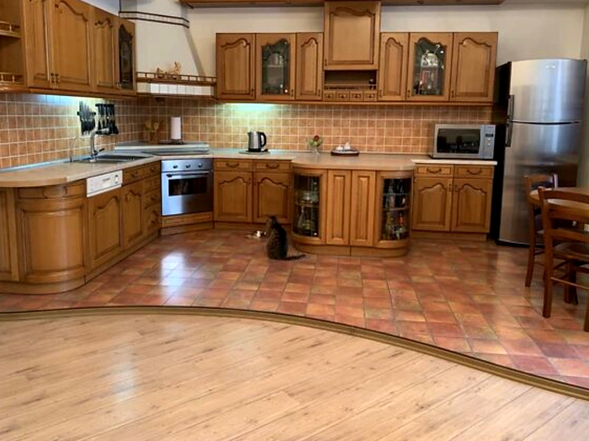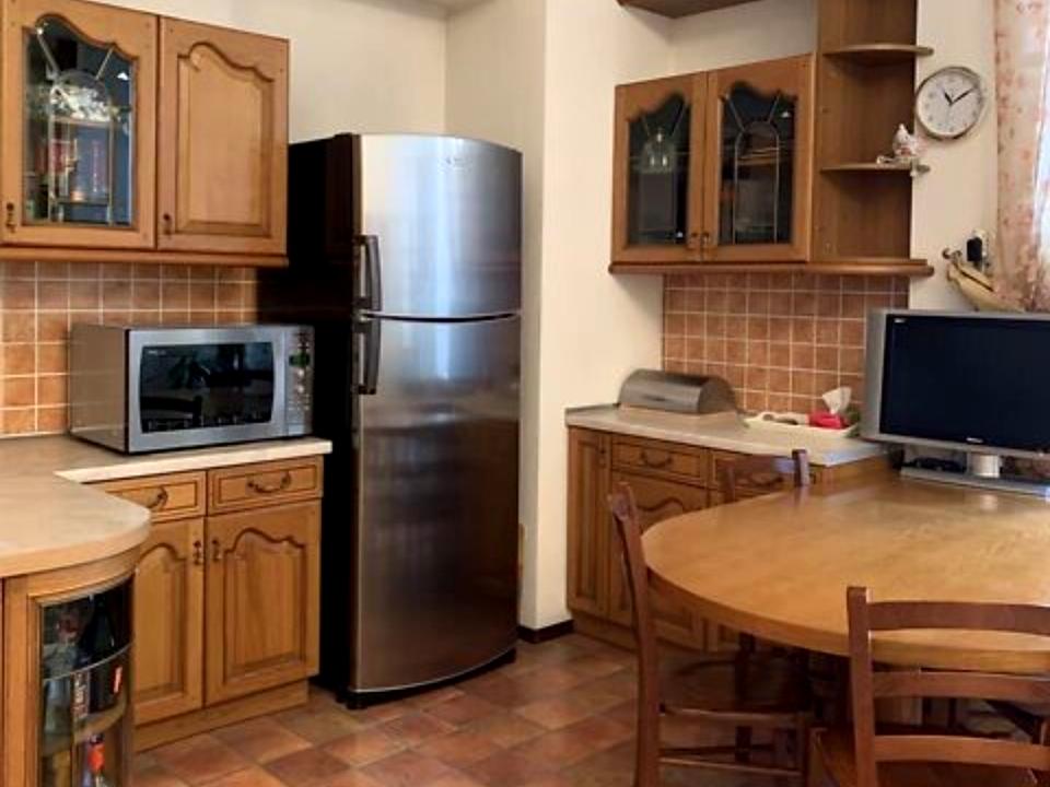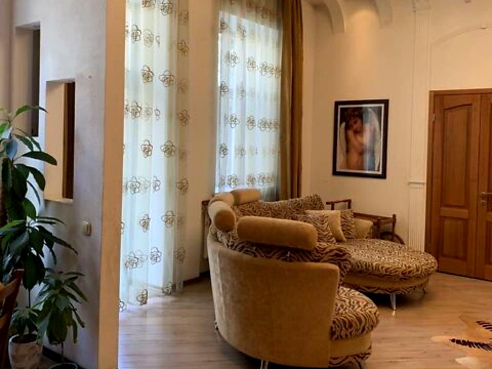 Велика коридор з ходом. Простірна кухня - столова. Кабінет. Три спальні.Дві гардеробні.Гістовий санвузл.Велика ванна з туалетом, бидо, душовою кабіною, ванною з джакузі.Фінська сауна.Великий засклений балкон у двір і Балкон на вулицю. Котельня-будинка. Мобіль: кухня з натурального дерева.Спальні з ліжками, диванами, з шафами.Пол: кафе, ламінат.Бронировані подвійні вхідні двері.