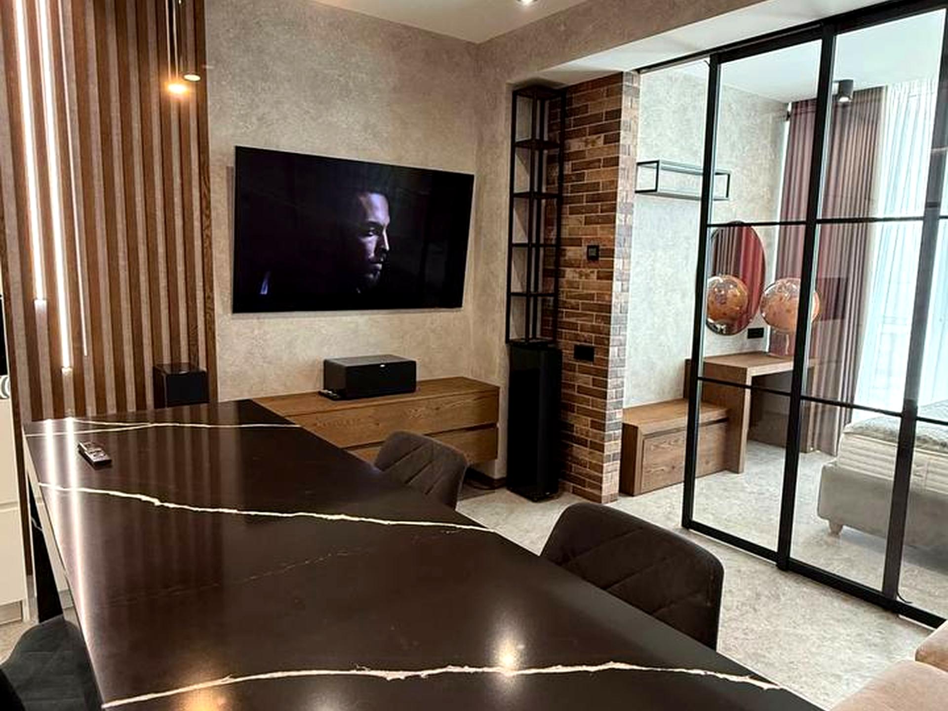Техника: плита индукция, посудомоечная машина, микроволновая печь, холодильник, бойлер, кондиционер, стиральная машина, телевизор, аккустическая система.