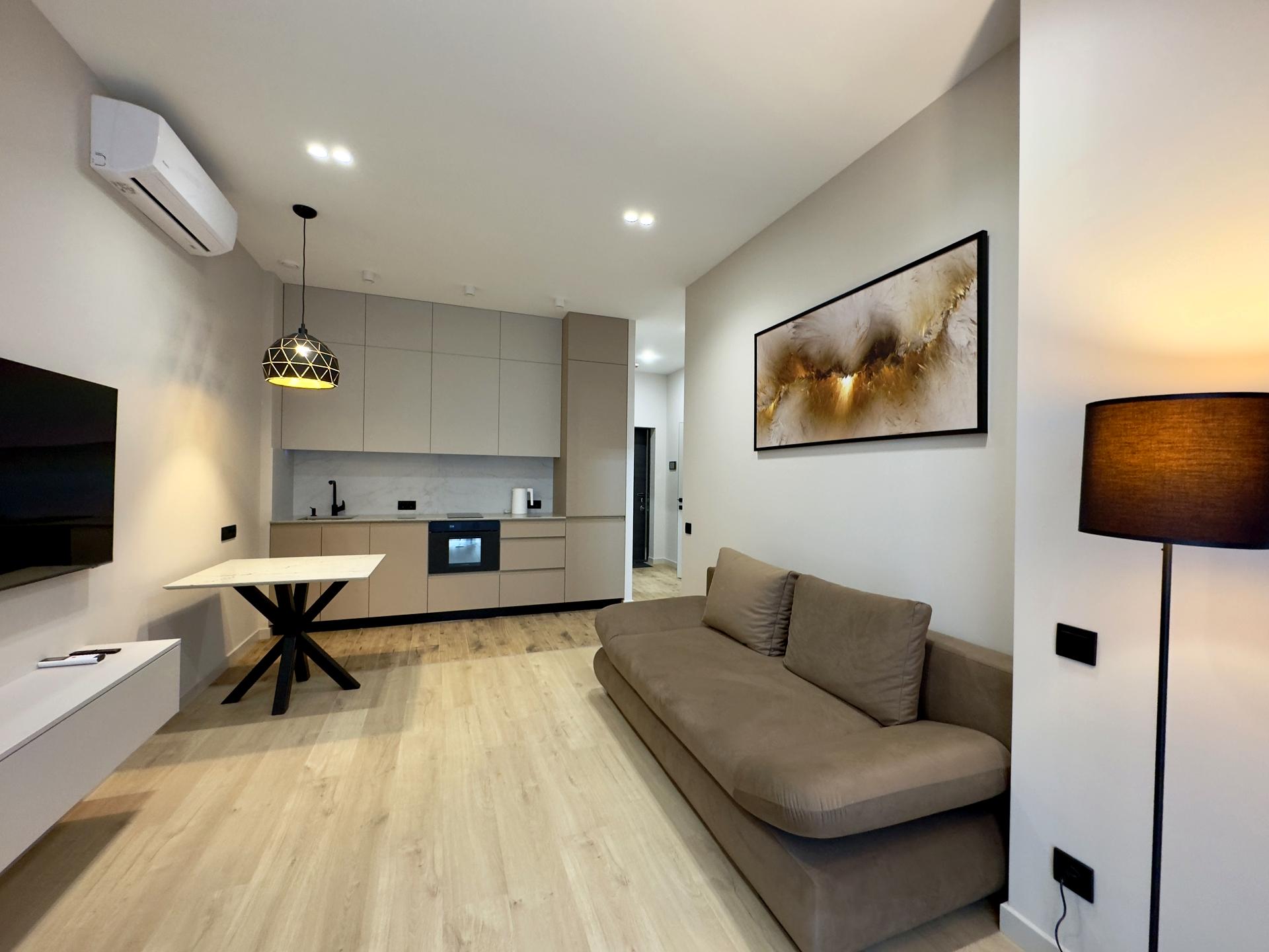 Квартира з сучасним дизайном - приємні кольорі , техніка - меблі - все для комфорту орендаря . Тепла підлога , 2 кондиціонера , багато варіантів освітлення . Автономне газове опалення .