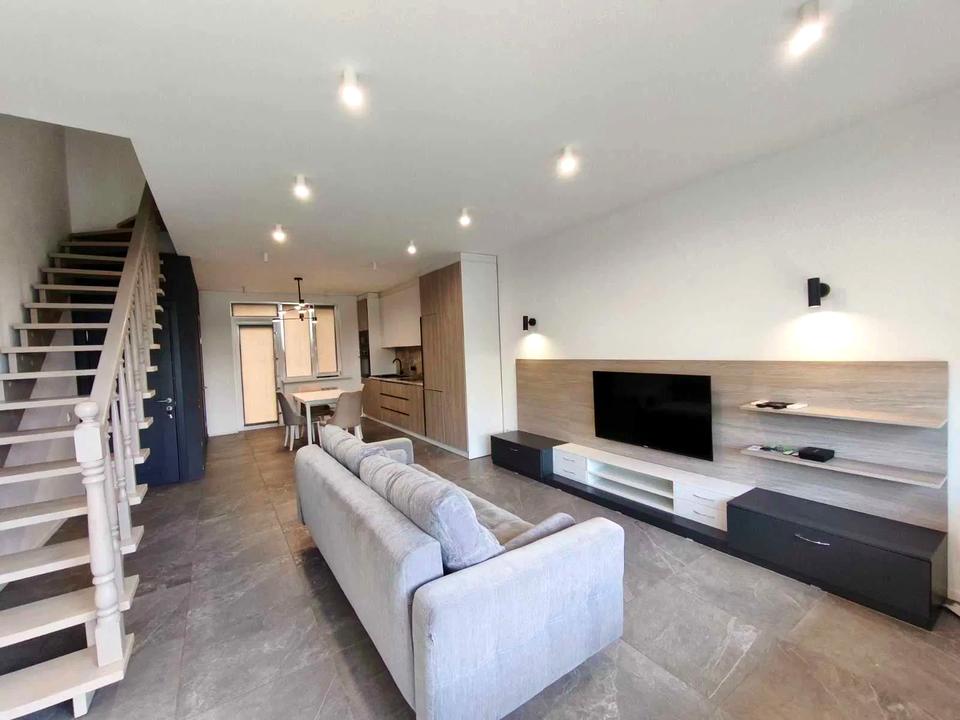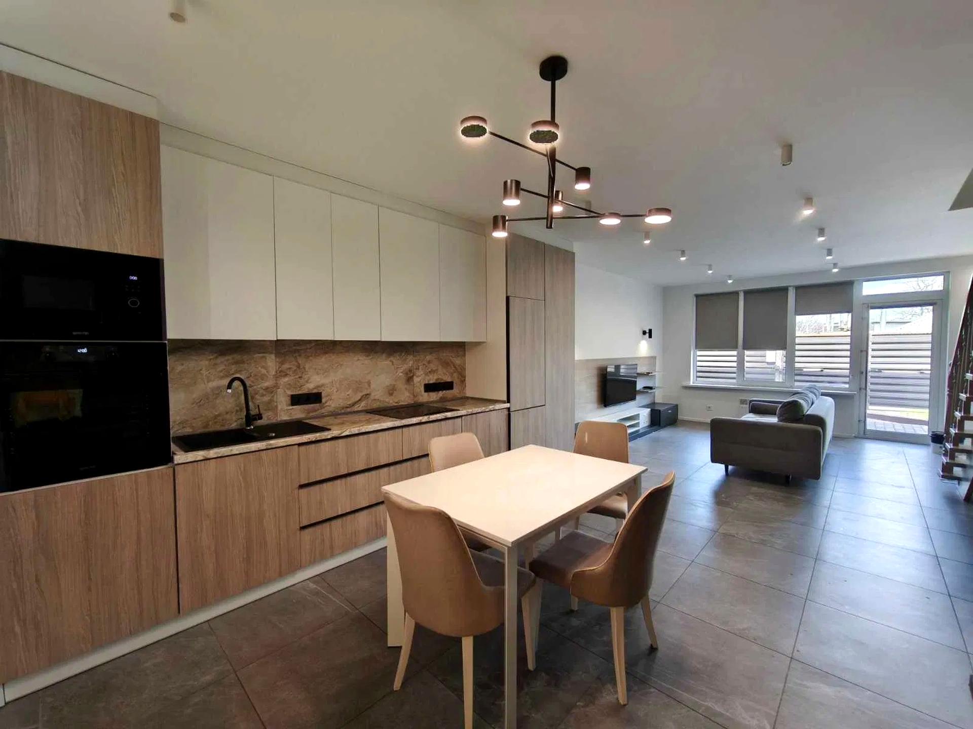 Пропонується таунхаус на вул. Леонтовича. Планування: кухня-вітальня, дві спальні, 3 санвузли, тераса. Якісний ремонт, меблі та техніка. Електро опалення. Закрита територія, парковка для авто.