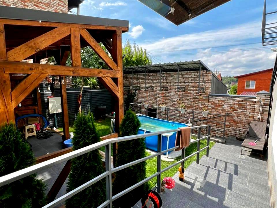 100 м2 двор с беседкой, бассейном, зоной барбекю + крытый паркинг на два автомобиля.