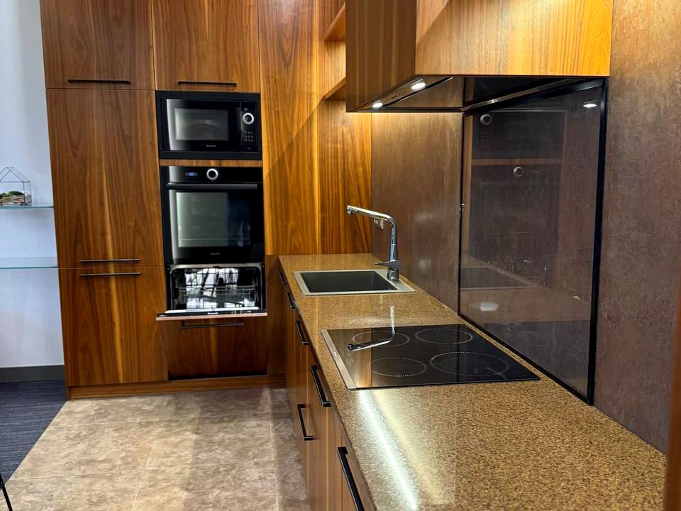 Встроенная кухня, место для отдыха, обеденная зона.