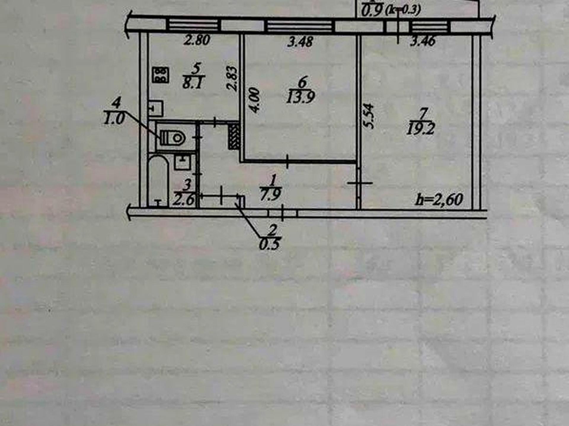 Загальна площа - 55 кв.м: кухня 8кв.м, 2 окремі кімнати, суміжний санвузол, балкон, вікна дерев'яні.