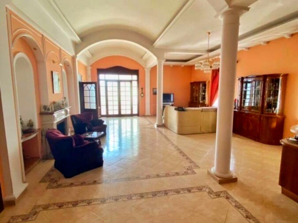 — Велика вітальня 74 м² з м’якою та обідньою зонами, каміном та кухнею
