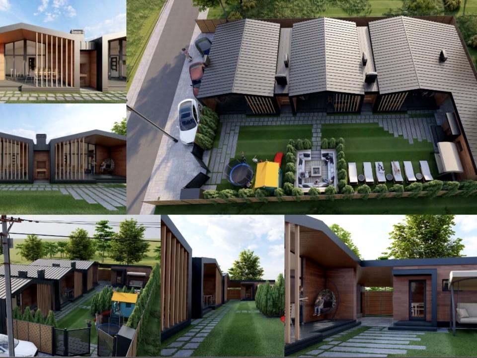 3 котеджні будиночки (47 кв.м. кожен) + приміщення під сауну (15 кв.м.) + технічне приміщення (15 кв.м.).