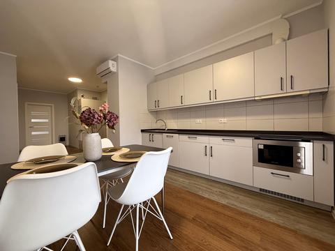 В просторій кухні є все необхідне для комфортного проживання:мікрохвильова піч, індукційна плита, духова шафа,посудомийка, смарт телевізор,пральна машина з сушаркою.