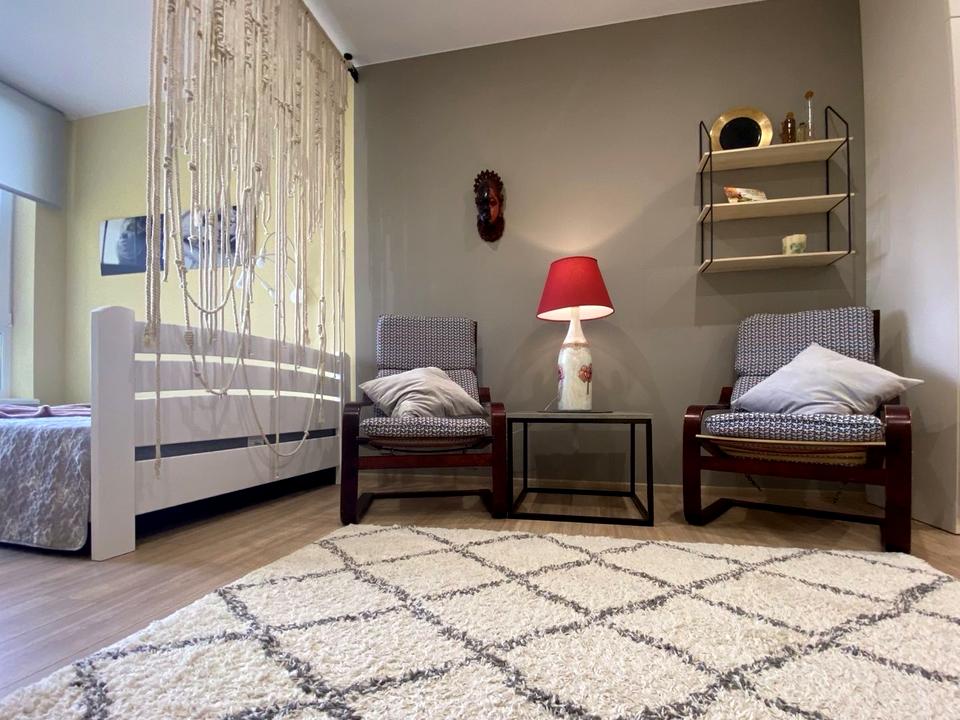 Квартира зроблена з урахуванням сучасних тенденцій. Велика система для зберігання речей. Є ліжко, зона вітальні.
