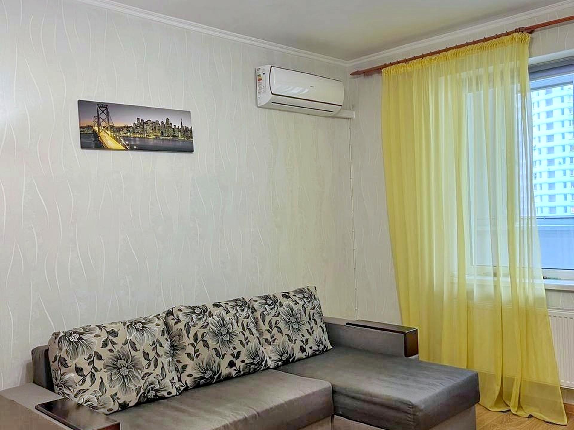 Будинок - Бетонно монолітний, в квартирі 1 кімната. Вид з вікон у двір. Квартира стандартна, планування кімнат Роздільне. Немає газу, кухонна плита електрична. Гаряча вода - централізована. Опалення центральне. Суміщений санвузол, Туалет/ванна. Є сантехніка. Немає підігріву підлоги. Є балкон. Вікна металопластикові. В квартирі є Телевізор, Шафа, Холодильник, Пральна машина, Мікрохвильовка, Кондиціонер, Лічильники. Будинок побудований в 2011 році. Загальний стан квартири - Євроремонт. Поруч є школа, дитсадок, зупинки, розважальні заклади, супермаркет, парк, річка/озеро. Інтернет оптоволоконний. Комісія за послуги 50 %