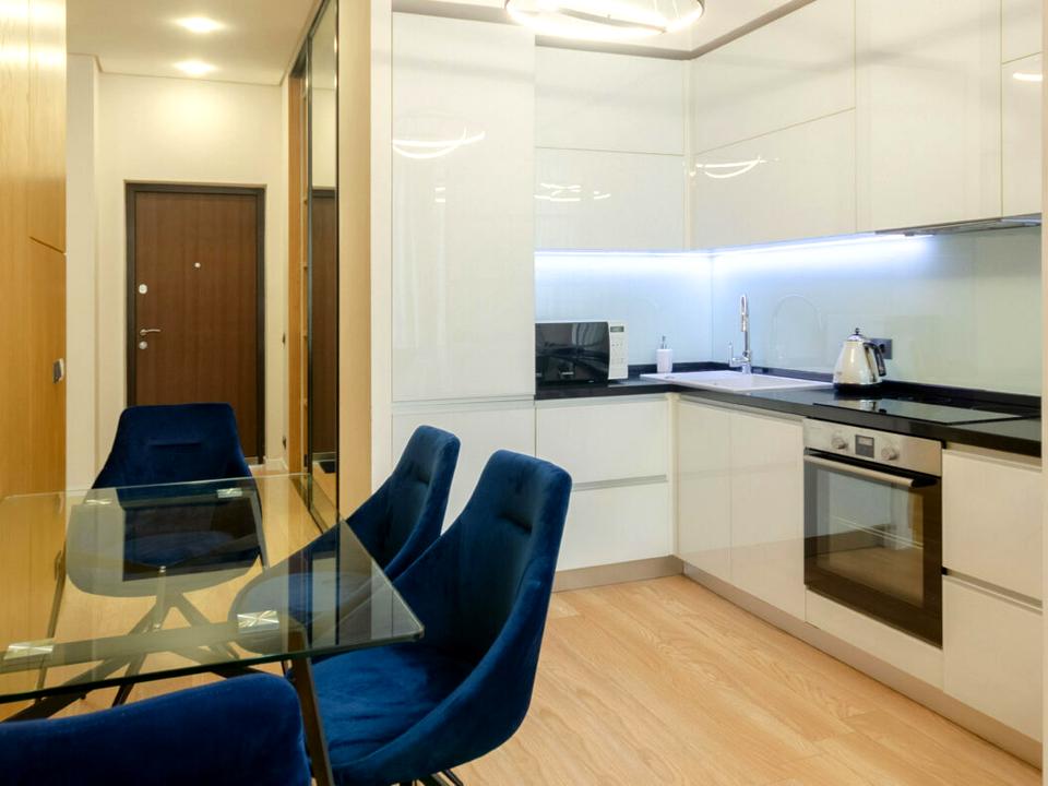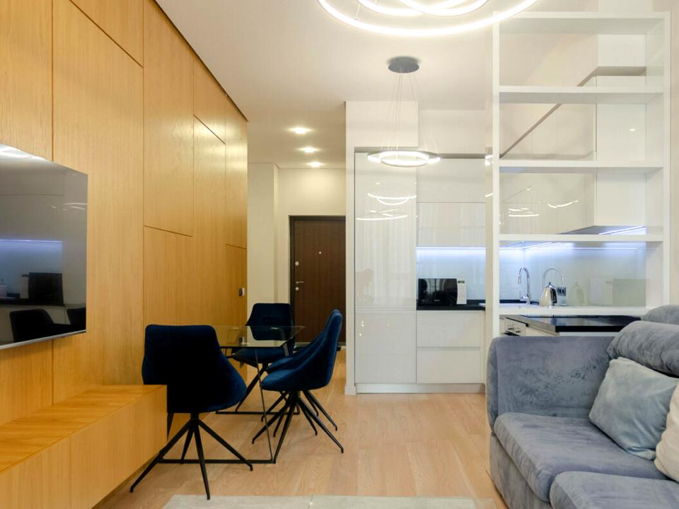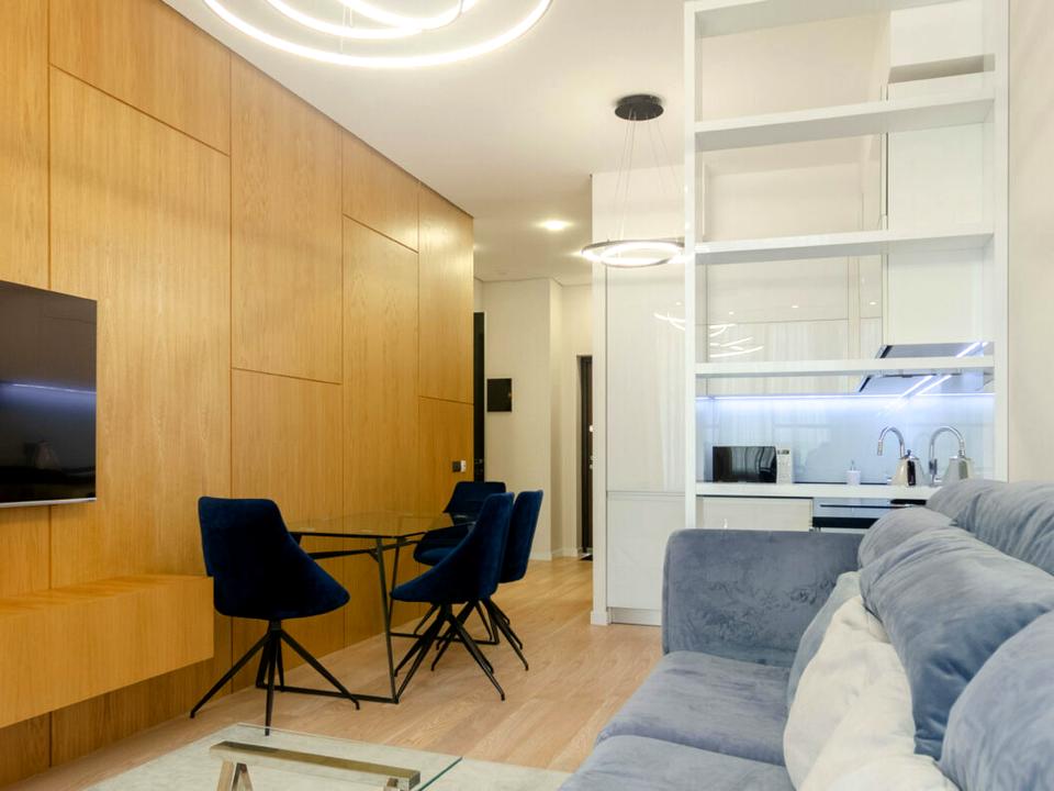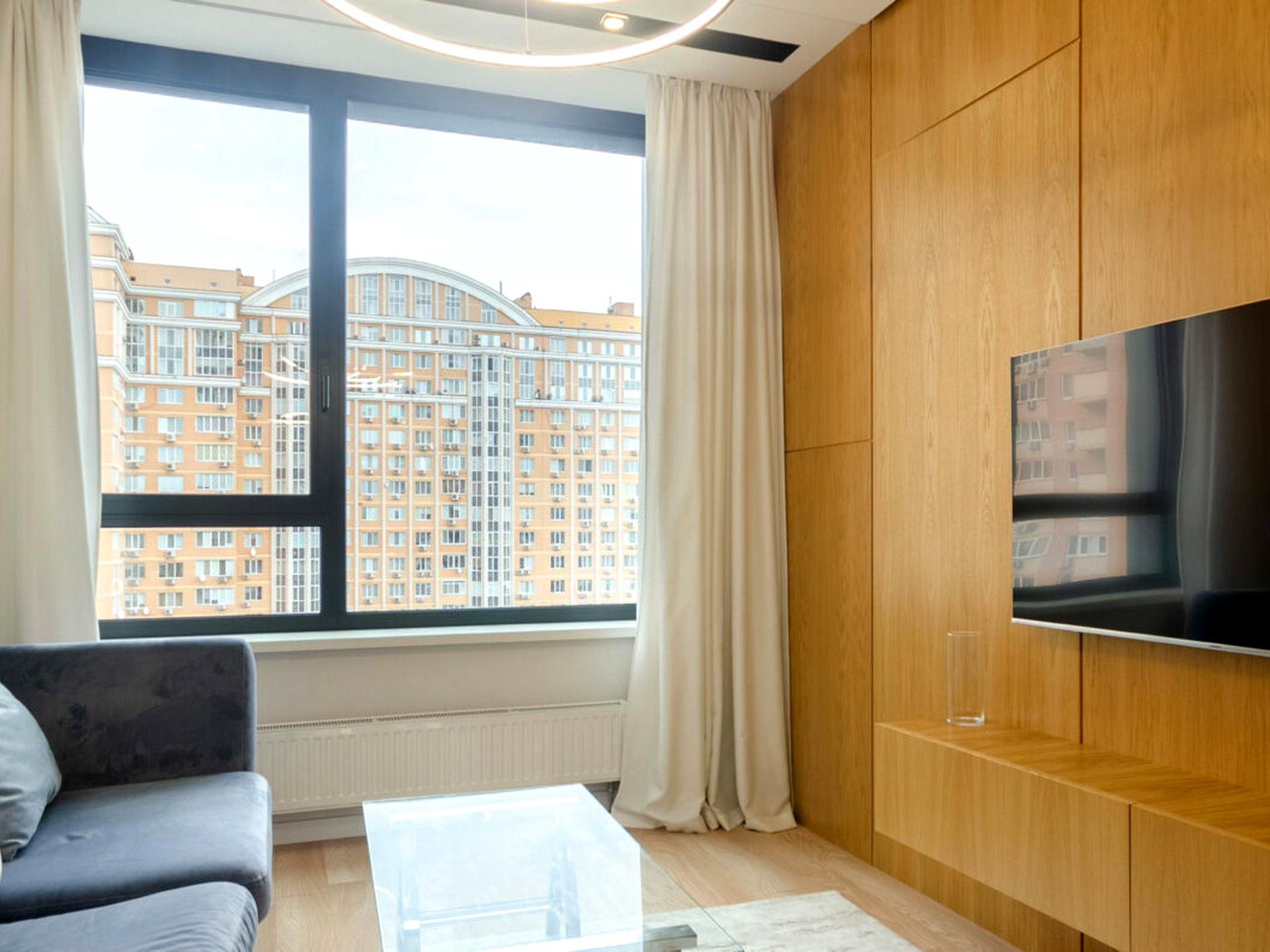 Квартира знаходиться на 12 поверсі площею 60 м, має окрему спальню з виходом на лоджію, стильну вітальню з кухнею та санвузол.