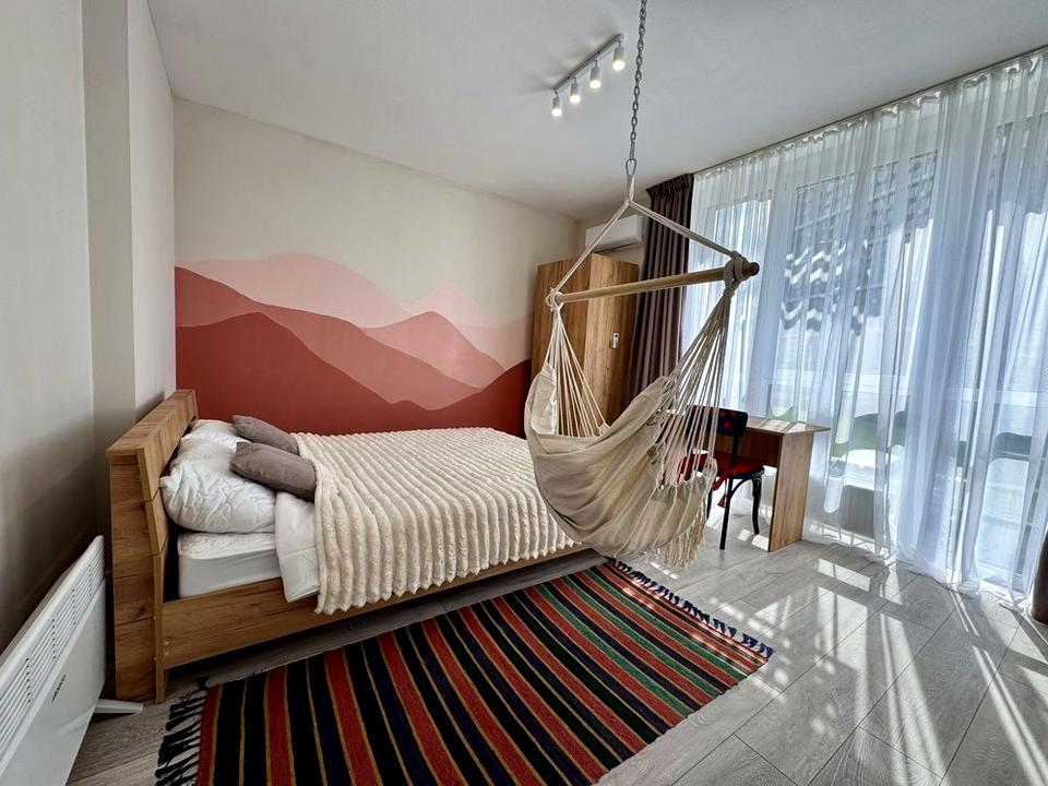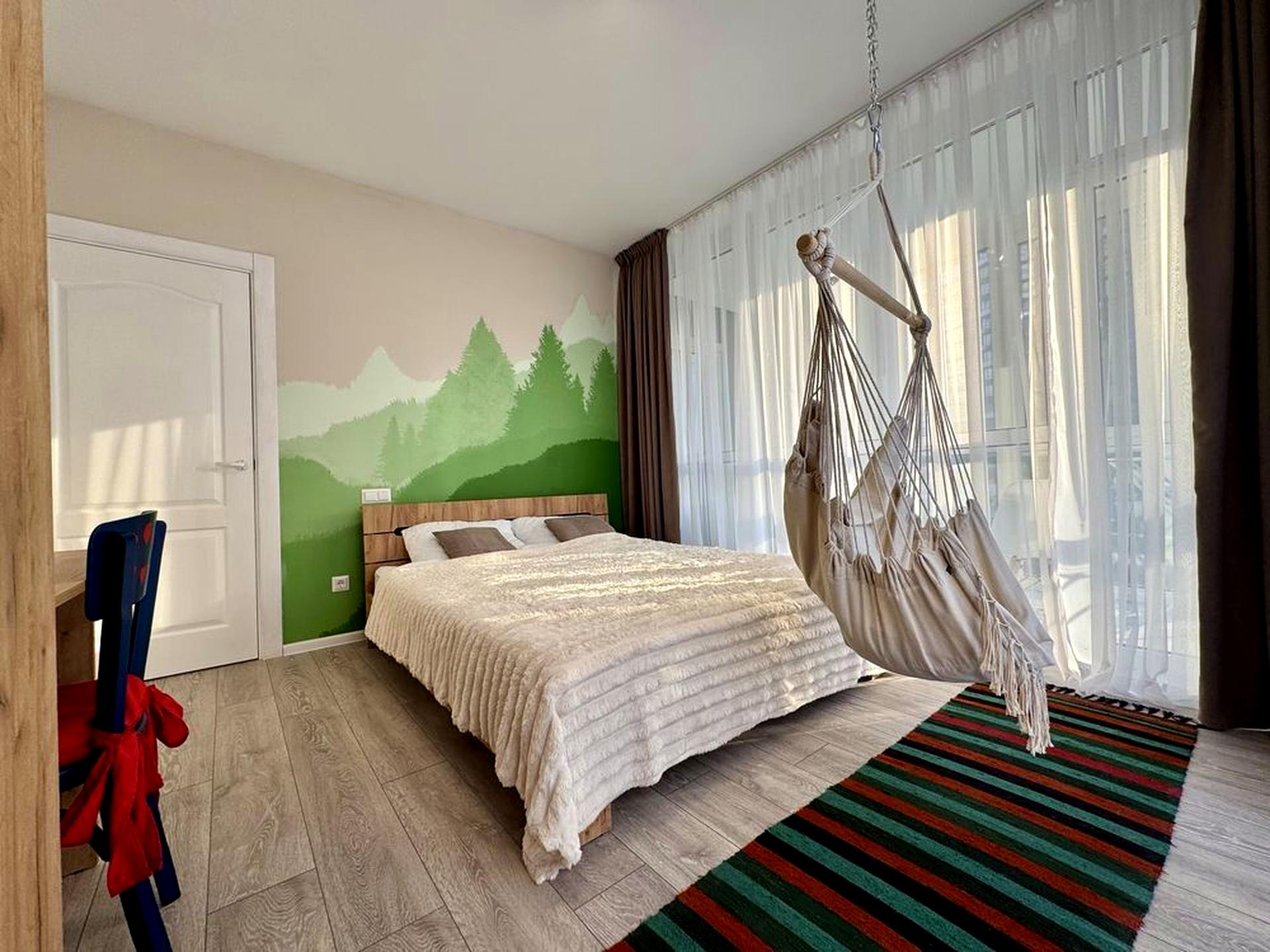 Кожна з кімнат обладнана двоспальним ліжком з ортопедичним матрацом, робочим місцем, шафою, кондиціонером і зручним кріслом-гамаком для релаксу.