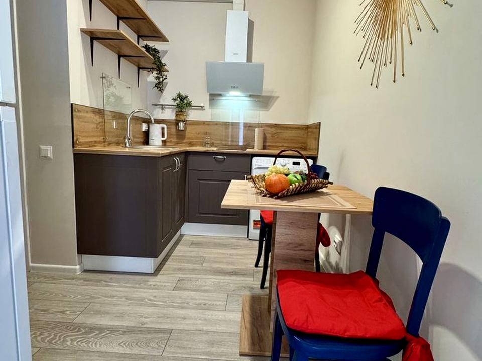 Кухня повністю обладнана, є варильна панель без духової шафи, мікрохвильова піч, холодильник, пральна машина, електрочайник, стіл для обіду із стільцями, достатньо місця для зберігання продуктів і посуду.
