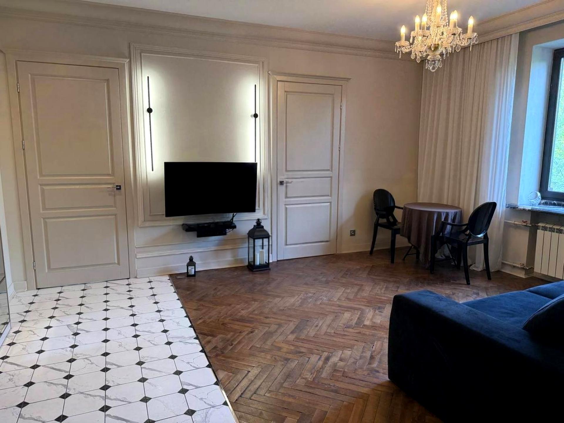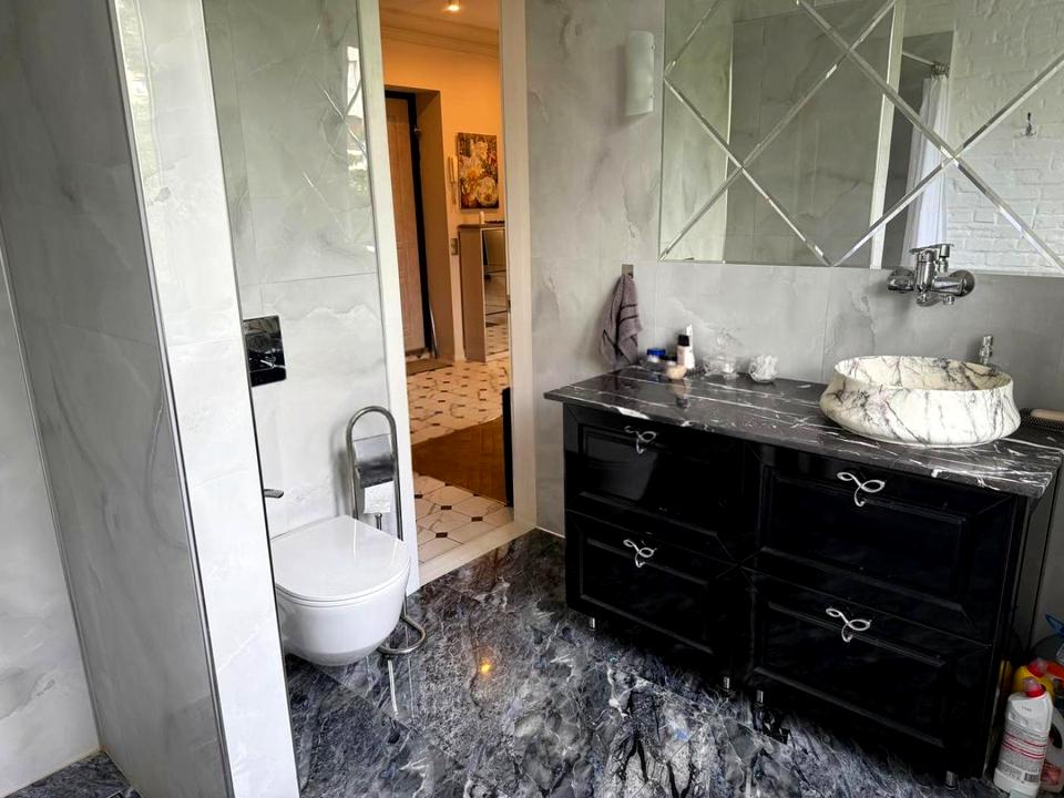 У квартирі збережено автентичну атмосферу: справжній реставрований паркет, мармурові підвіконня, хрустальні люстри та дизайнерський диван, який додає простору вишуканості й затишку.