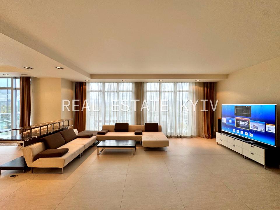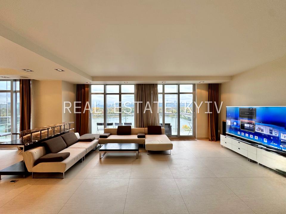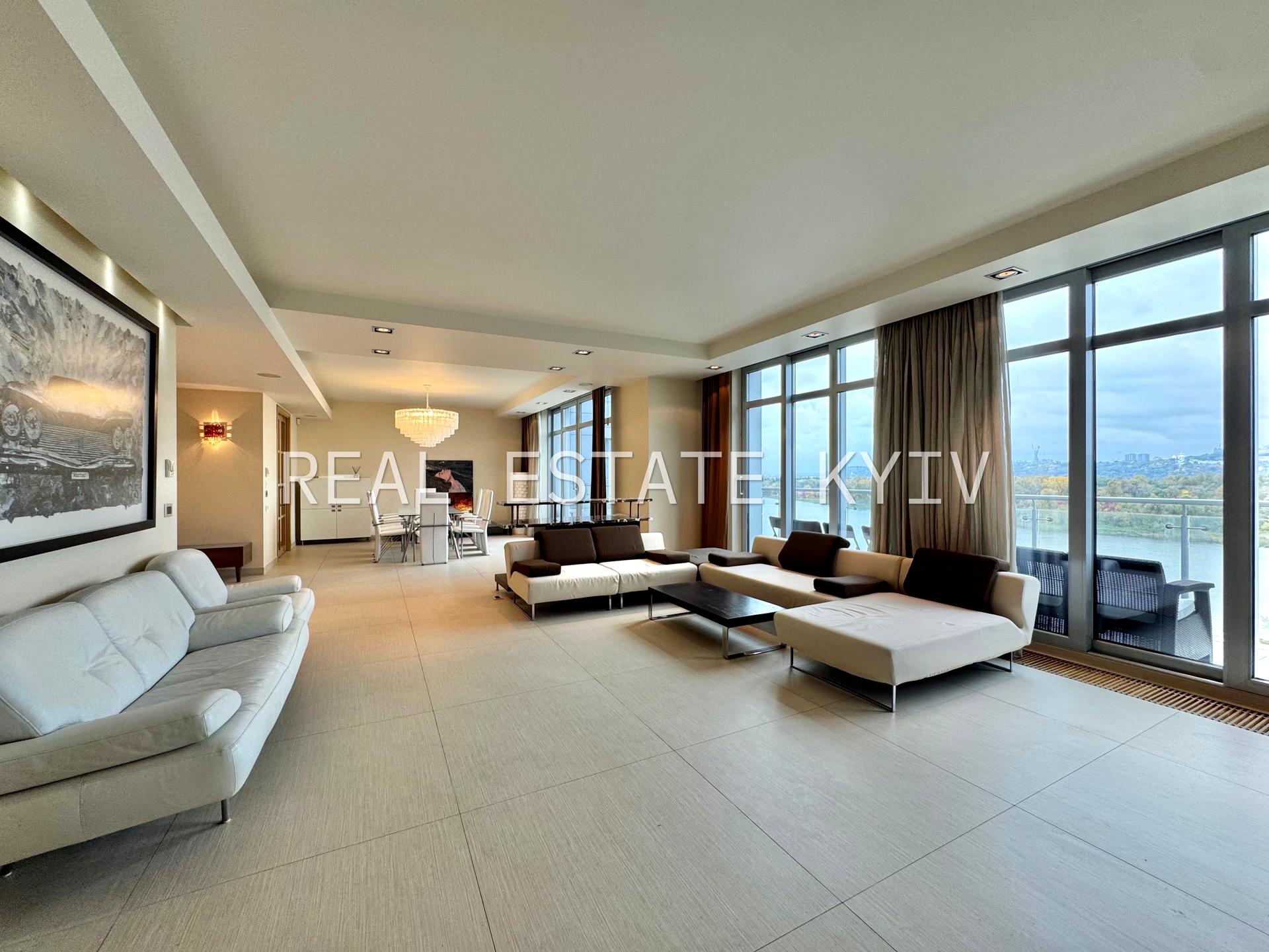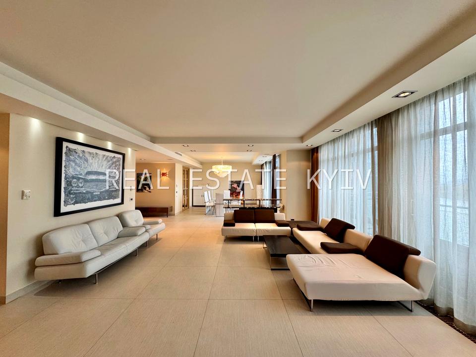 Функціональне планування: простора вітальня з панорамним видом на Дніпро та виходом на терасу, дві спальні, кухня, три санвузли, дві гардеробні, пральня, передпокій, балкон.