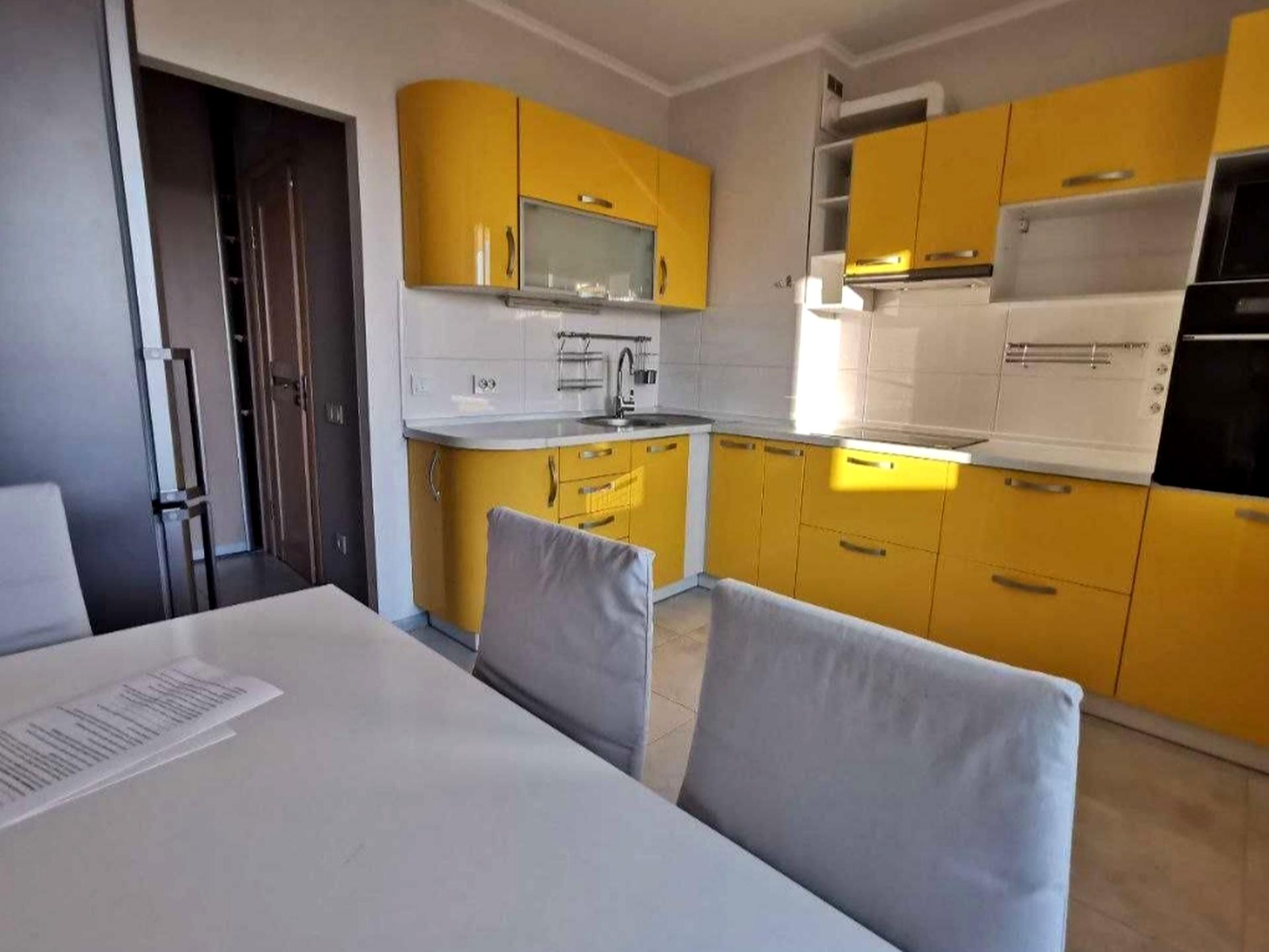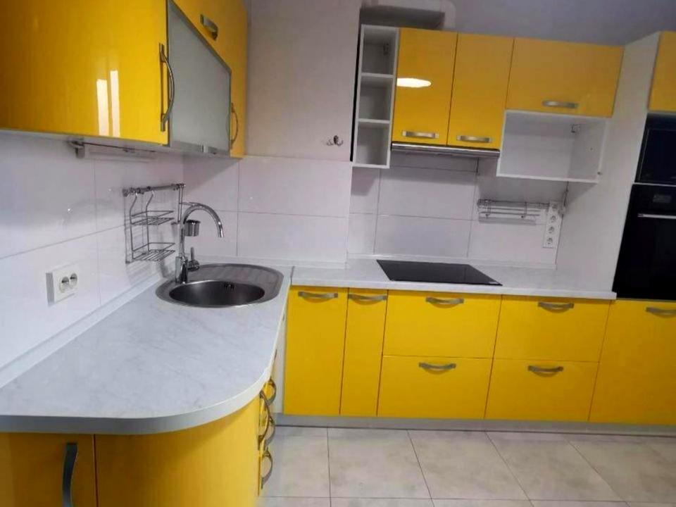 Яскраво-жовта кухня мебльована на замовлення, варильна поверхня, духова шафа, обідня зона, холодильник No frost, СВЧ. В коридорі 3 місткі шафи-купе, на лоджії обладнано робочий кабінет.
