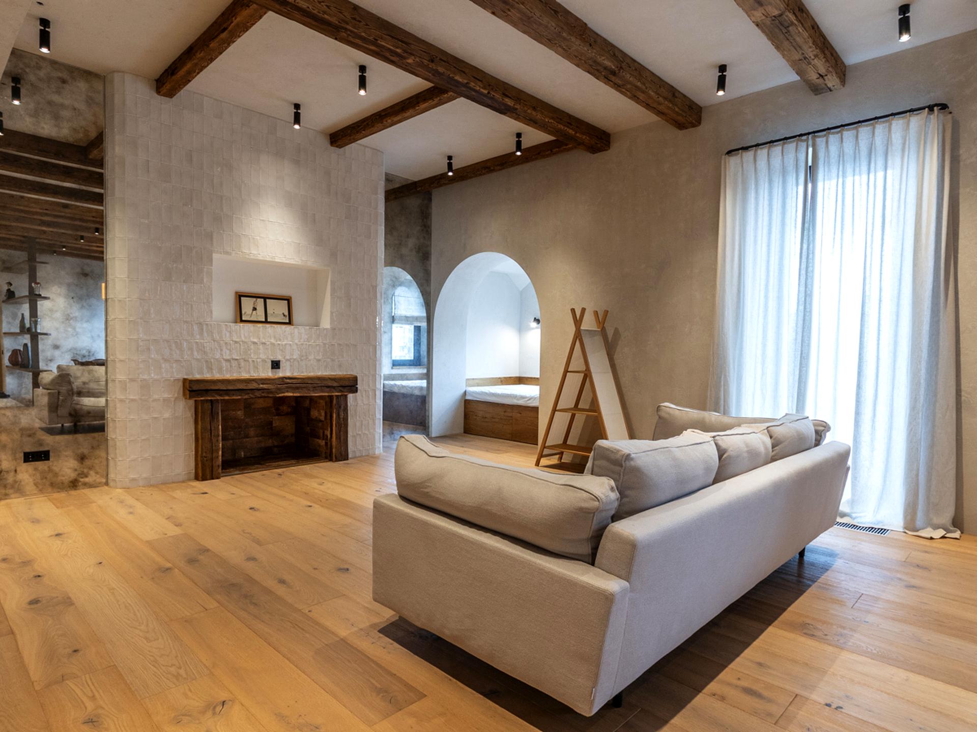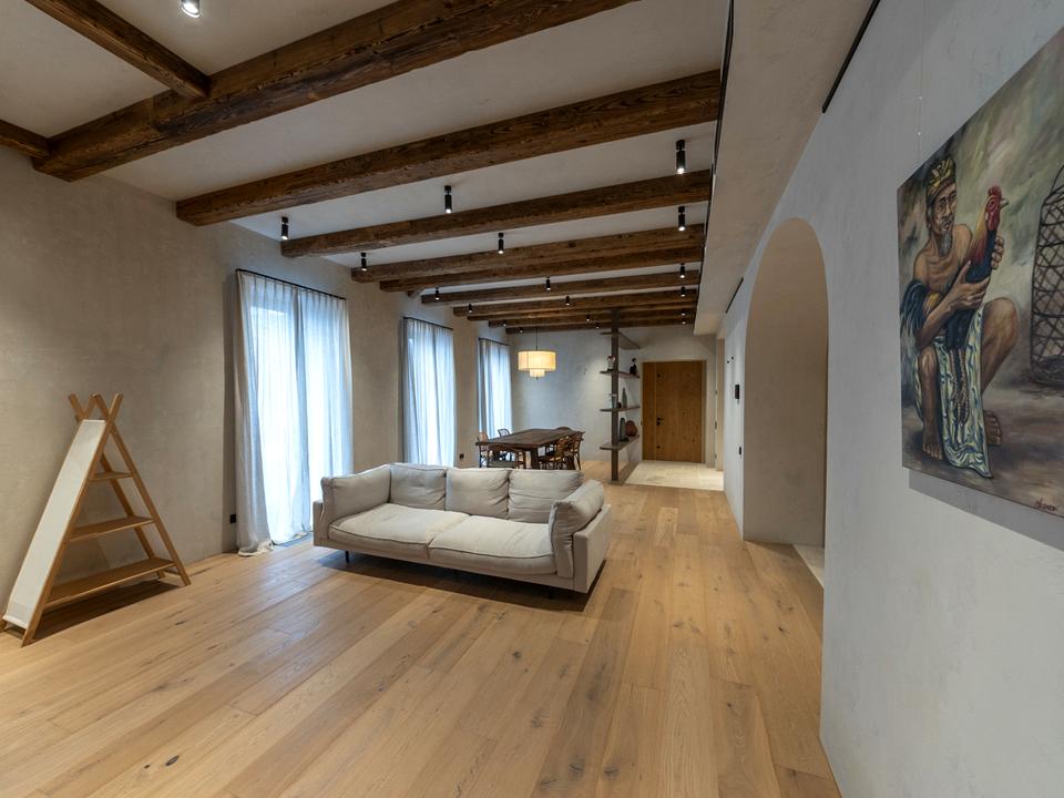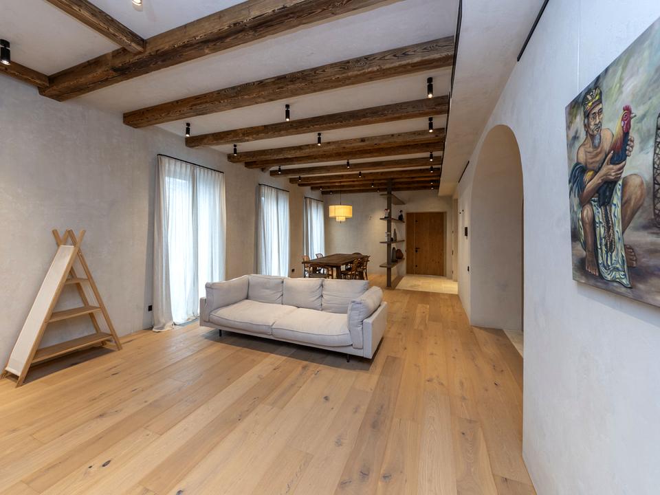 Квартира бездоганно оброблена натуральною штукатуркою, доповнена паркетом і мармуровою підлогою, а також автентичні дерев’яні елементи.