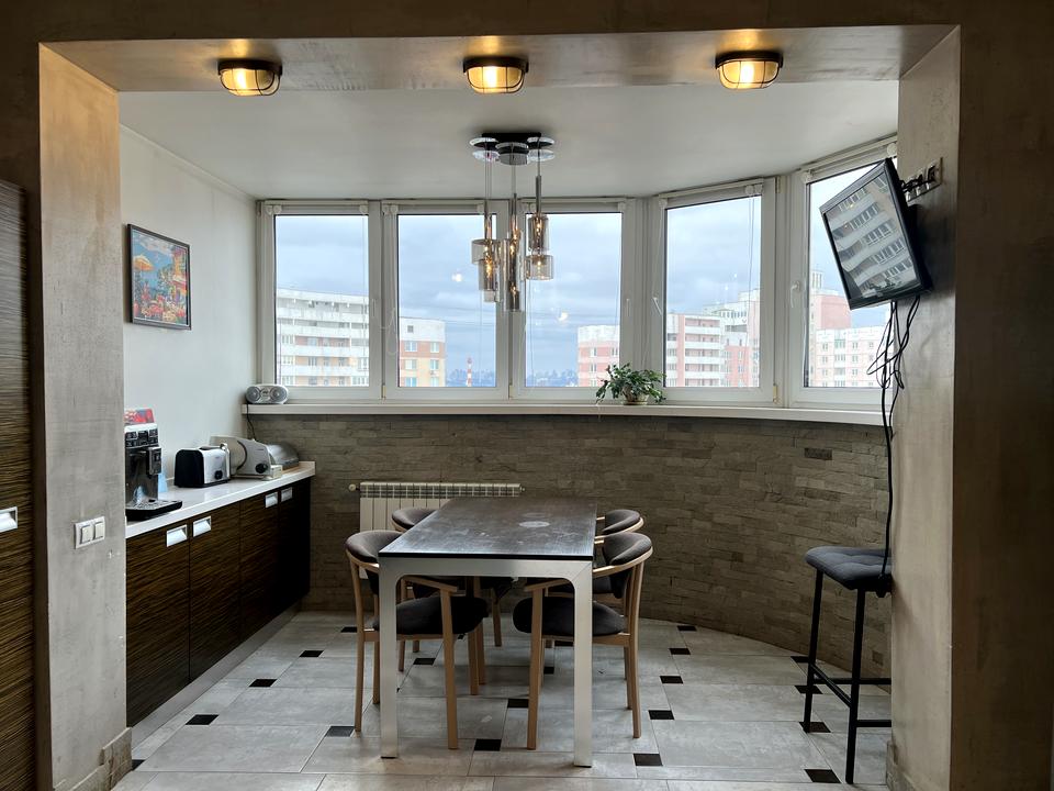 Квартира розташована на 18-му поверсі 20-поверхового цегляного монолітно-каркасного будинку з гарною звукоізоляцією. Загальна площа квартири складає 129.2 кв.м, житлова - 67;1 кв.м, кухня - 22.1 кв.м. Планування дуже зручне: 2 спальні, вітальня, велика кухня, 2 санвузли, ванна кімната з ванною та душовою кабіною, гостьовий санвузол, хол, вбиральня 4.6 кв.м. Вікна обладнані 2-камерними склопакетами. Оздоблення стін - фарбування, підлога - ламінат, у кухні і ванній кімнаті підігрів підлоги.