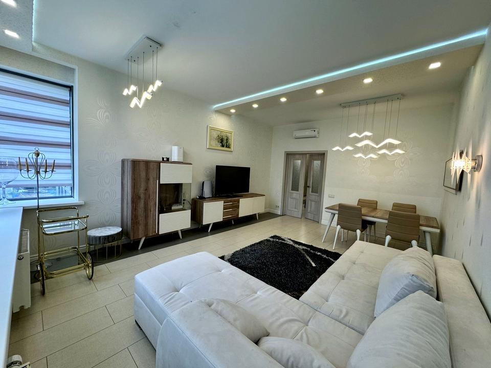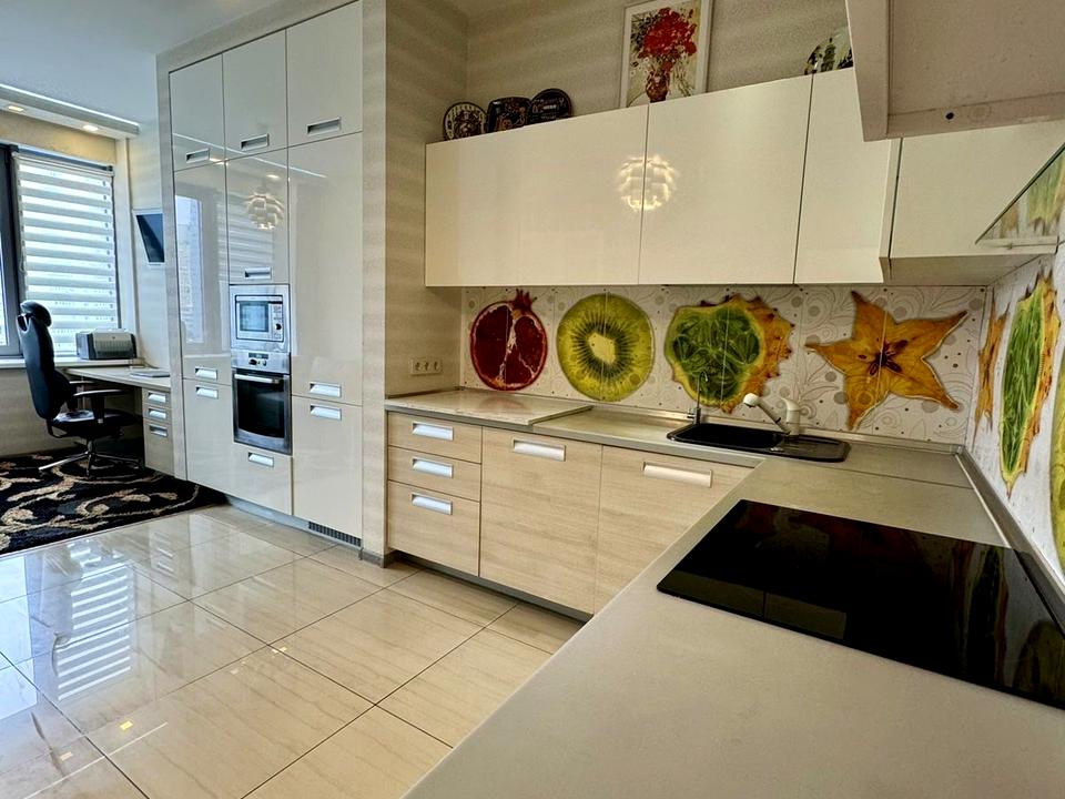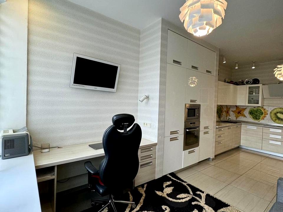 У квартирі виконано якісний сучасний ремонт, вона повністю мебльована та обладнана всім необхідним для комфортного проживання. Є зручні розкладні дивани, численні шафи для зберігання речей та вбудована побутова техніка, включаючи посудомийну машину, пральну машину, два холодильники, мікрохвильову піч, варильну поверхню та духову шафу. Для додаткової зручності встановлено бойлер та три телевізори.
