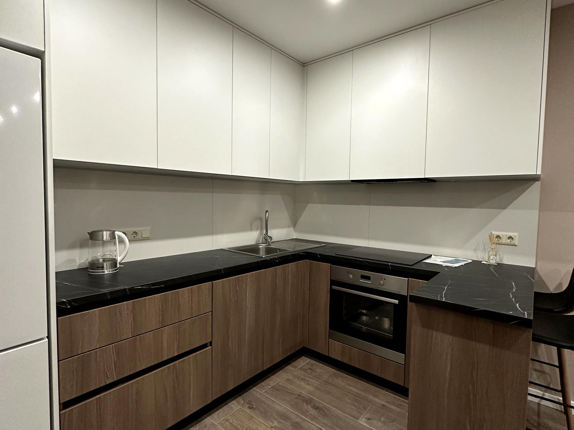 Кухонну зону із вбудованою технікою, включно з посудомийною машиною.